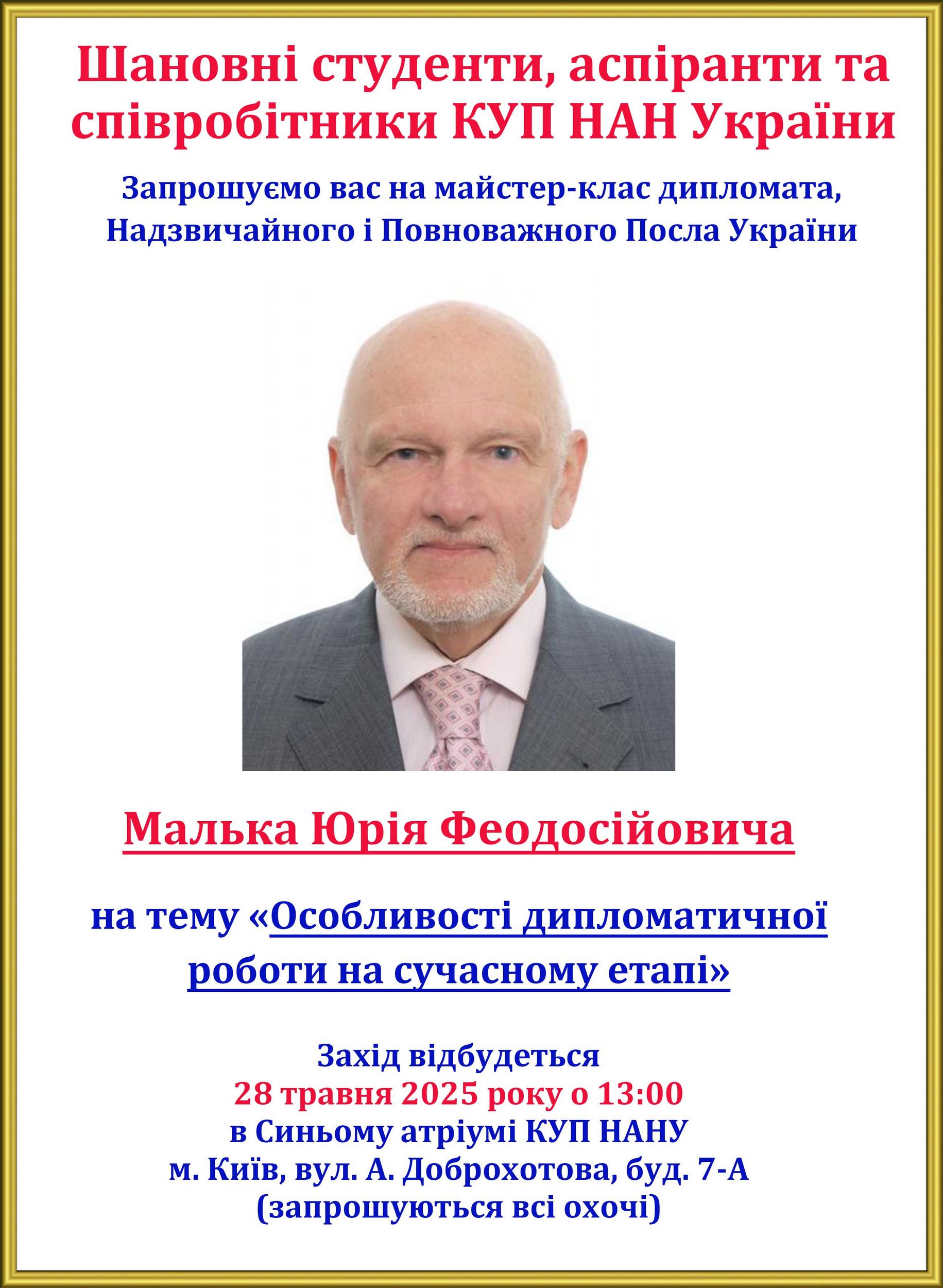 23 Травня, 2025 ОголошенняУвага! Запрошуємо на майстер-клас Надзвичайного і Повноважного Посла України Юрія Феодосійовича Малька