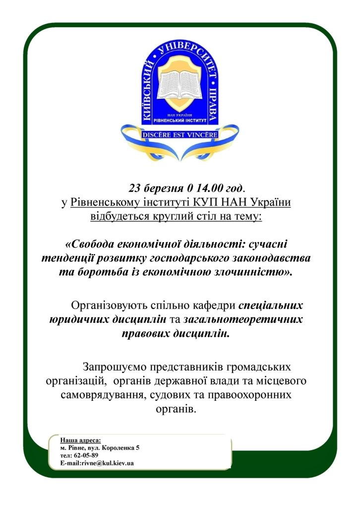 23 березня у РІ КУП НАНУ відбудеться круглий стіл на тему: «Свобода економічної діяльності»