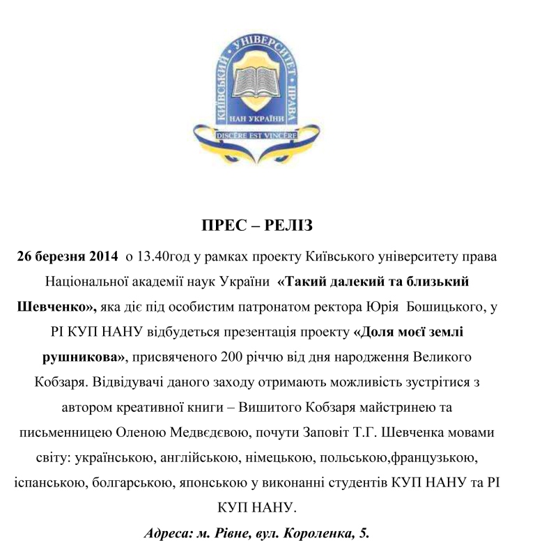 26 березня у РІ КУП НАНУ відбудеться презентація проекту «Доля моєї землі рушникова»
