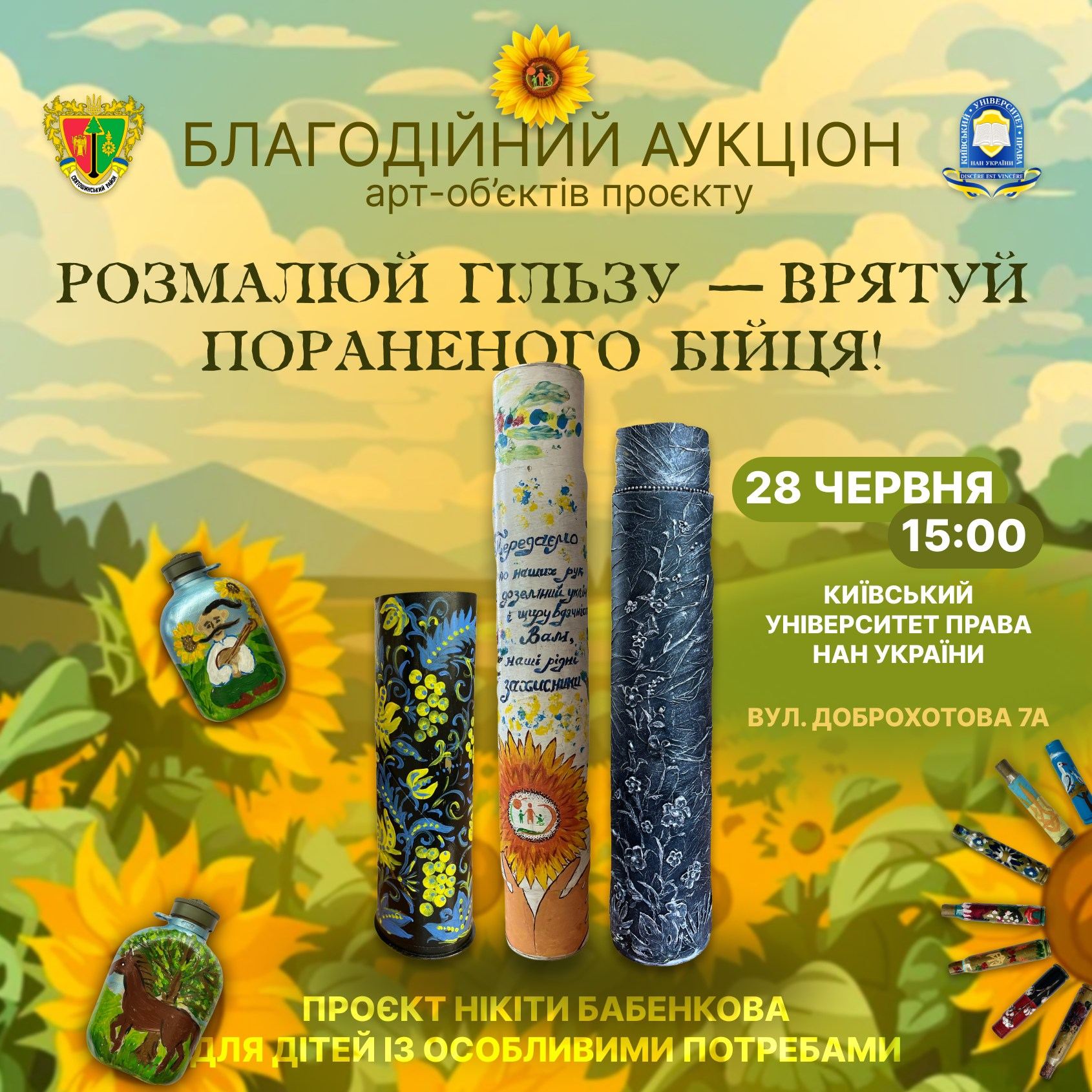 28 червня о 15:00 в Київському університеті права НАН України відбудеться благодійний аукціон арт-об’єктів проєкту «Розмалюй гільзу − врятуй пораненого бійця!». Захід організовано під особистим патронатом ректора КУП НАНУ Юрія Бошицького.