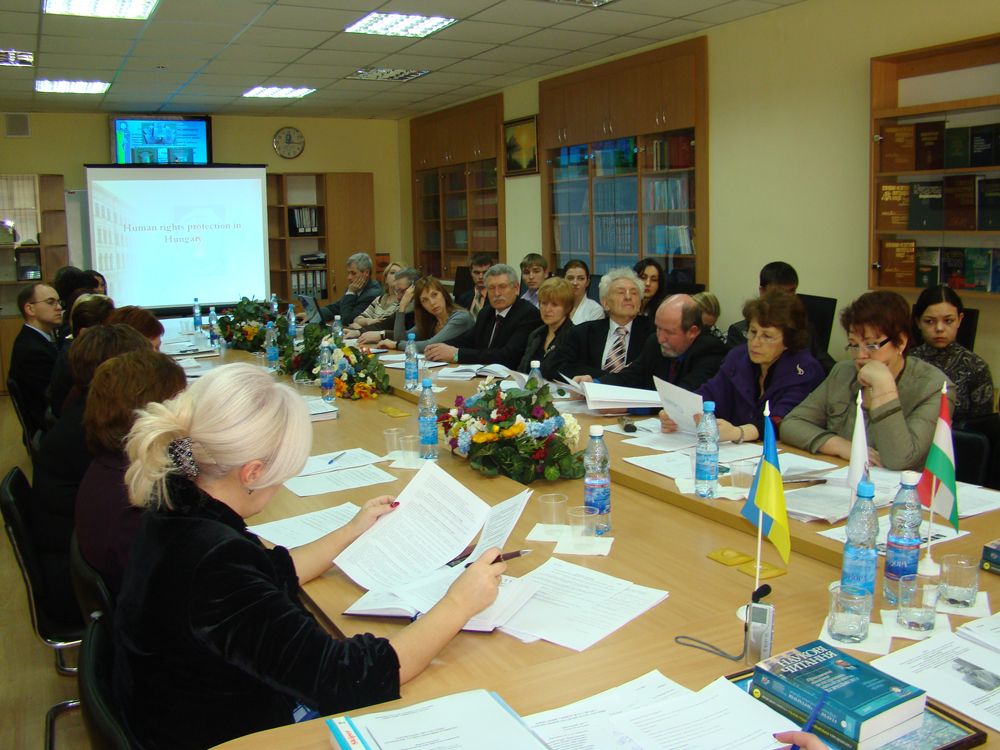Ректор Юрій Бошицький запросив до слова Аттілу Петерфалві, який у своєму виступі охарактеризував основні повноваження омбудсмена, яких в Угорщині чотири: уповноважений парламенту (загальний омбудсмен), уповноважений парламенту з прав людини, уповноважений парламенту із захисту особистих даних і свободи інформації та уповноважений парламенту з етнічних меншин. Інститут омбудсмена в Угорщині був запроваджений у 1989 році з прийняттям змін до Конституції Угорщини (1949р.). Омбудсмен Угорщини – колегіальний орган, який має спільний офіс і бюджет. На один рік передбачається близько 6 млн. євро для забезпечення діяльності Бюро Парламентарських Комісарів Республіки Угорщина. На завершення доповіді А. Петерфалві запросив викладачів і студентів відвідати Угорщину для ознайомлення з діяльністю Парламенту та Бюро Парламентарських Комісарів Угорщини.