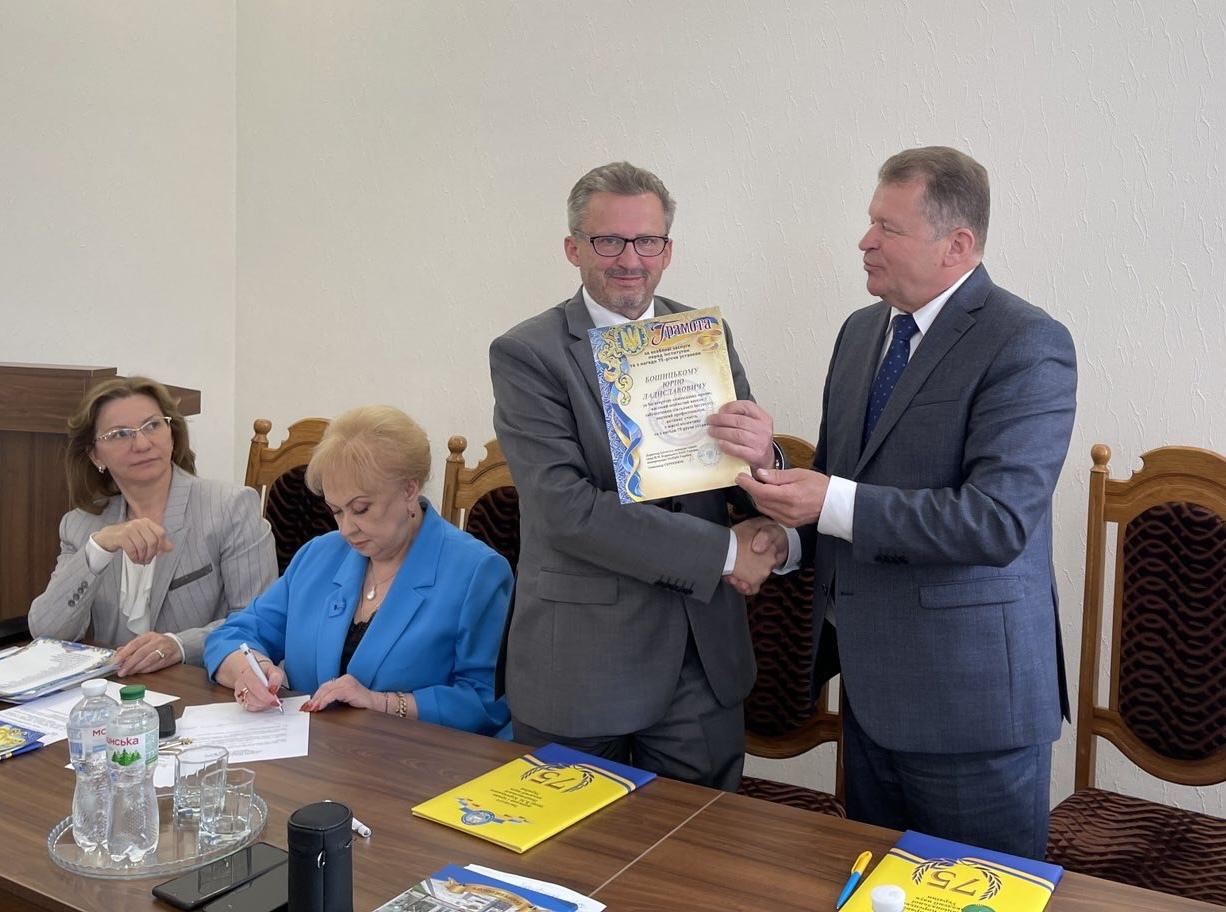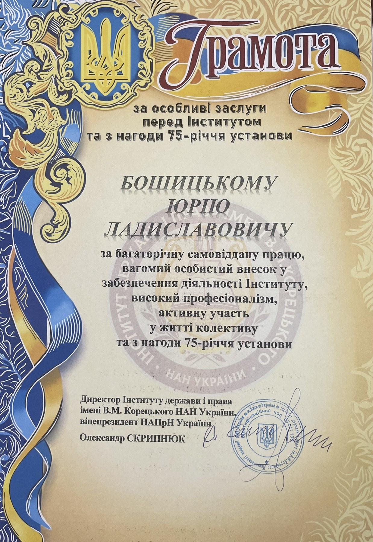 На завершення відбулося урочисте нагородження з нагоди 75-річчя інституту. Ректора КУП НАНУ Юрія Бошицького було відзначено грамотою за особливі заслуги перед Інститутом держави права імені В.М. Корецького НАН України з нагоди 75-річчя інституту.