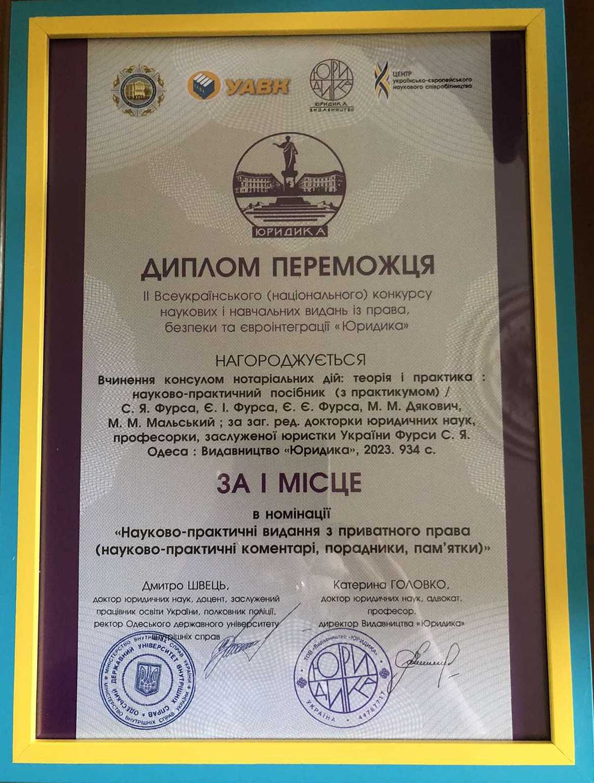 Колектив кафедри міжнародного права та галузевих правових дисциплін Київського університету права НАНУ вітає в.о. завідувача кафедри докторку юридичних наук, професорку, заслужену юристку України Фурсу Світлану Ярославівну та кандидата юридичних наук, професора Фурсу Євгена Івановича із заслуженою нагородою до Дня науки – отримання Диплому переможця II Всеукраїнського (національного) конкурсу наукових на навчальних видань з права, безпеки та євроінтеграції «Юридика» за книгу «Вчинення консулом нотаріальних дій: теорія і практика (з практикумом). Одесса, Видавництво «Юридика»,2023. 934с. за I місце у номінації Науково-практичні видання з приватного права(науково-практичні коментарі, порадники, пам`ятки)».