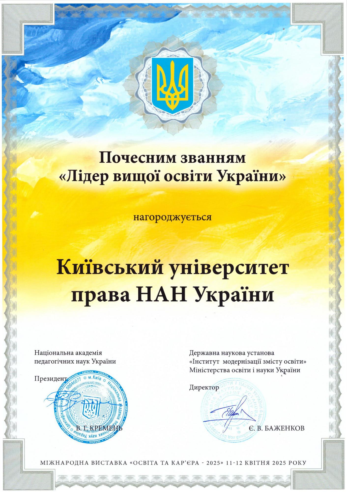 Київський університет права НАН України нагороджений почесним званням «Лідер вищої освіти»