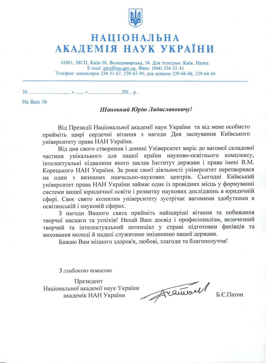 На адресу Університету надійшли вітання від Народних депутатів України А.С. Гриценка та В.В. Кличка, Київського регіонального центру НАПрН України, Рівненської обласної державної адміністрації, Чорноморської районної державної адміністрації Автономної Республіки Крим, Союзу юристів України, Вищої кваліфікаційної комісії суддів України, Вищої ради юстиції та численних партнерів КУП НАНУ, зокрема, Агенції розвитку Східної Європи (EEDA), Національного органу по захисту даних та свободі інформації Угорщини, Товариства «Україна-Болгарія» та вищих навчальних закладів: Університету міста Сегед (Угорщина), Університету національного та світового господарства і Варненського вільного університету імені Чорноризця Храброго (Болгарія), Вроцлавського університету (Польща), Національного університету «Юридична академія України імені Ярослава Мудрого», Національної академії внутрішніх справ, Ужгородського національного університету, Київського міжнародного університету тощо.