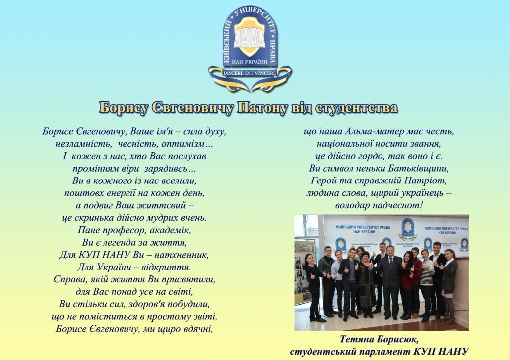 Напередодні Дня науки ректор, професор Юрій Бошицький та делегація студентів мали зустріч з президентом Національної академії наук України, академіком Борисом Патоном. У рамках зустрічі ректор проінформував Бориса Патона щодо інноваційних форм у навчально-виховному процесі, про наукову діяльність професорсько-викладацького складу. Особливої зацікавленості мала інформація щодо видання юридичного науково-теоретичного щоквартального збірника праць науковців «Часопис Київського університету права». Було представлено світлини нового Міжнародного центру правових та історико-політичних досліджень країн Центрально-Східної Європи КУП НАНУ у м. Львові. Основними завданнями Центру є: сприяння гармонізації українського законодавства із європейським правовим полем у суспільно-політичній, економічній, культурно-просвітницькій, освітньо-науковій та інших сферах суспільного життя; формування національно-патріотичного світогляду серед широких верств населення і національної еліти як Львівщини, так і України загалом; реалізація суспільних ініціатив шляхом взаємодії з центральними і місцевими органами влади. Право вибороти до складу делегації виборювали студенти, випускники університету, взявши участь у конкурсі написання поезії на честь Бориса Патона – науковця із світовим ім`ям. Зустріч пройшла у теплій, щирій атмосфері, студенти були глибоко зворушені цією історичною зустріччю, привітали із травневими святами, подарувавши квіти вдячності за увагу до КУП НАНУ, продекламували поезію та запросили на традиційні заходи університету.