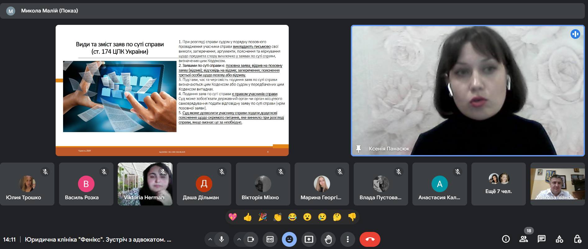 Онлайн-зустріч здобувачів вищої освіти юридичної клініки «Фенікс» КУП НАН України з практикуючою адвокатесою