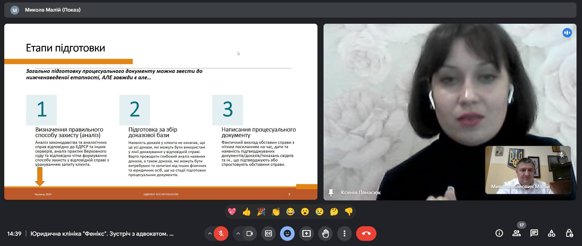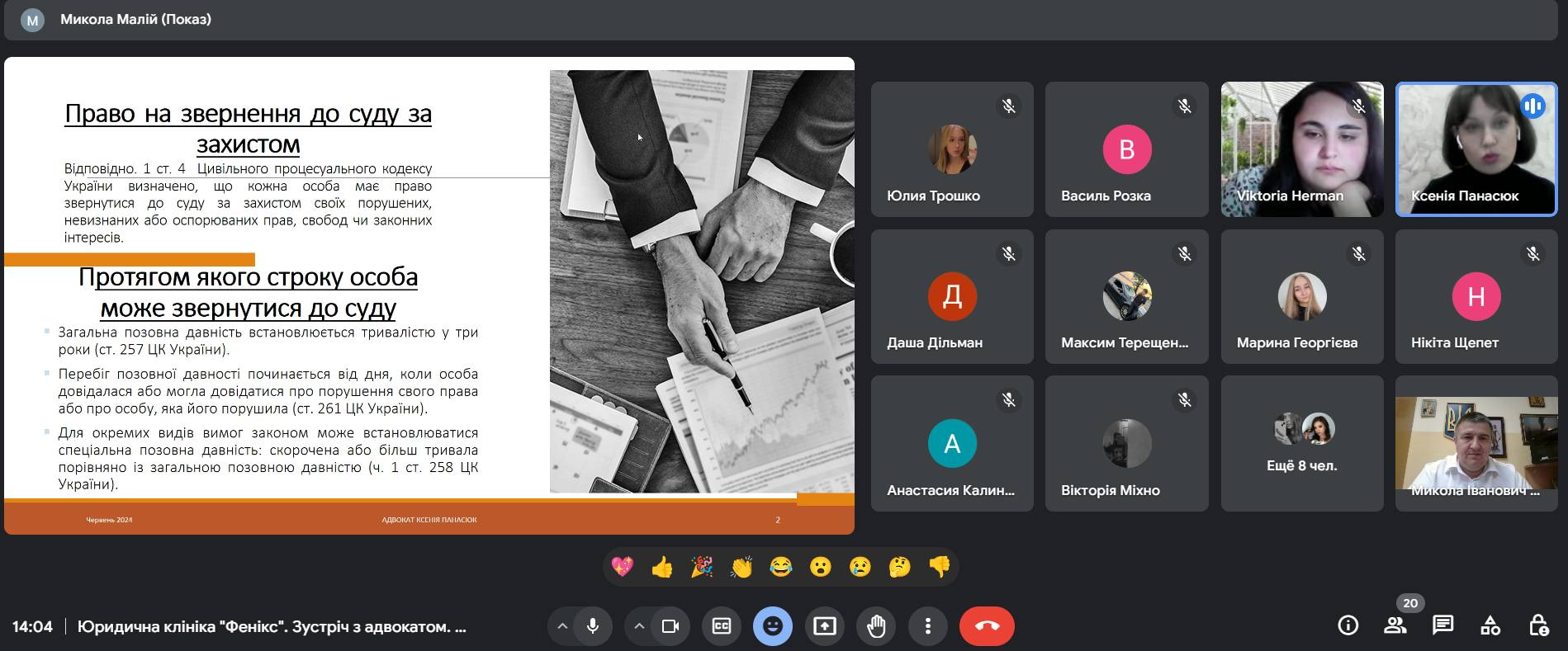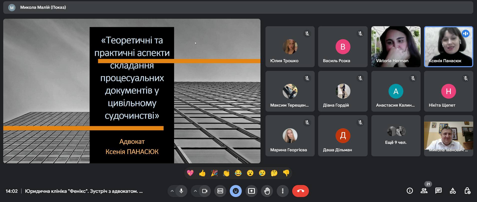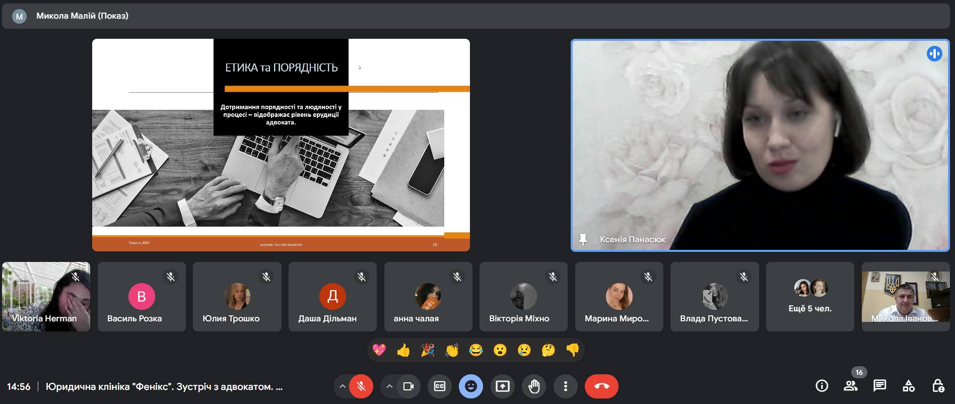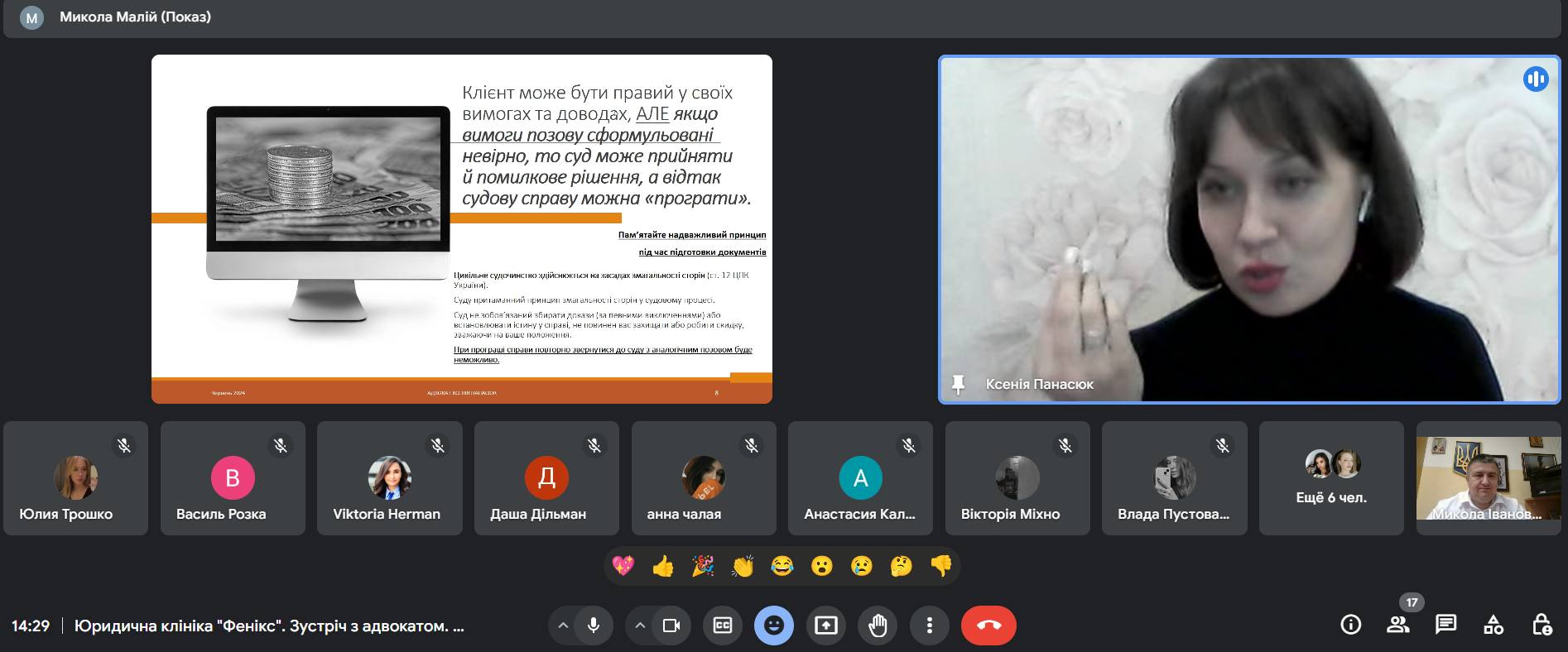 Онлайн-зустріч здобувачів вищої освіти юридичної клініки «Фенікс» КУП НАН України з практикуючою адвокатесою