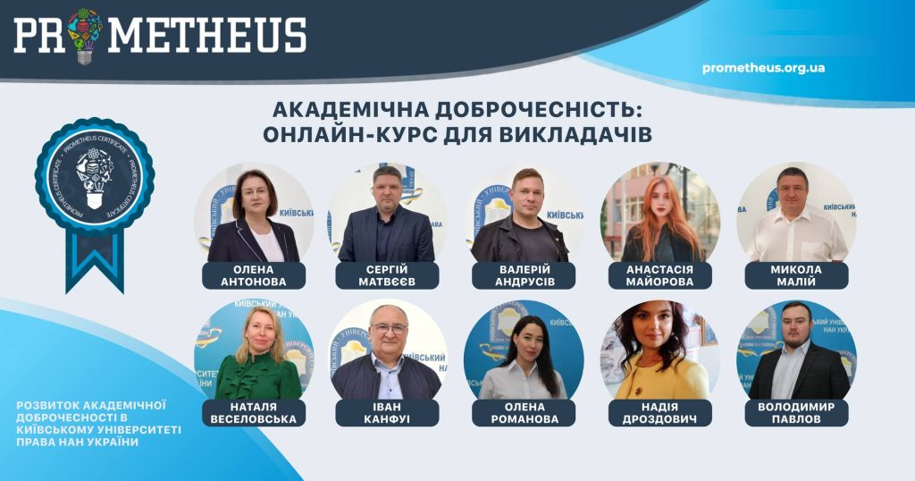 За сприяння радника ректора Ірини СОПІЛКО та під керівництвом проректорки з навчально-методичної роботи Олени АНТОНОВОЇ, завідувача відділу з забезпечення якості освіти Сергія МАТВЄЄВА та завідувача кафедри кримінально права та процесу Валерія АНДРУСІВА науково-педагогічний персонал університету пройшов через платформу масових відкритих онлайн курсів Prometheus курс підвищення кваліфікації «Академічна доброчесність: онлайн курс для викладачів».