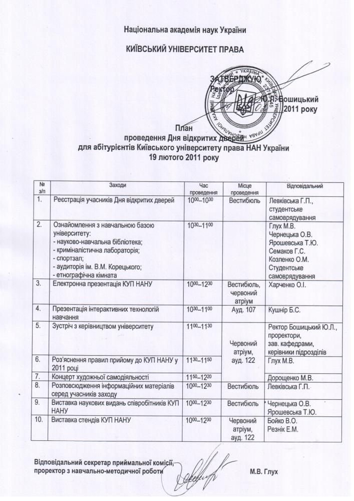 План проведення Дня відкритих дверей для абітурієнтів Київського університету права НАН України