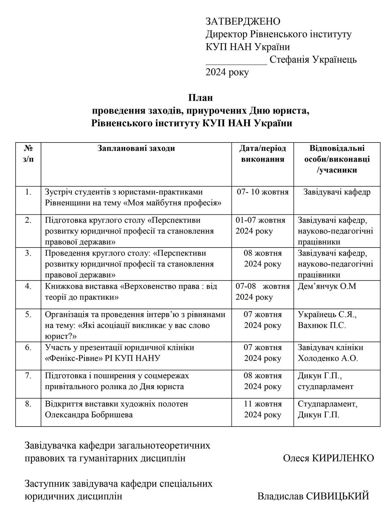План проведення заходів, приурочених Дню юриста, Рівненського інституту КУП НАН України