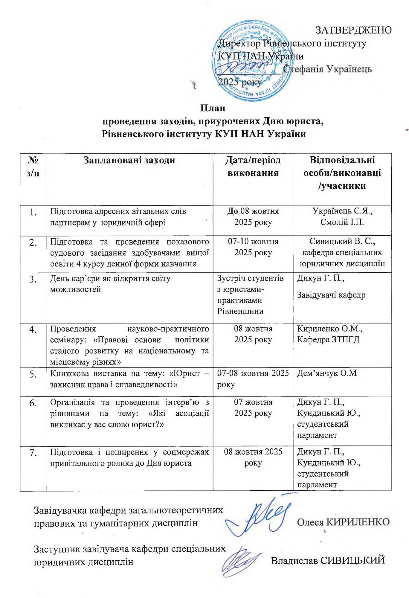План проведення заходів в РІ КУП НАН України, приурочених Дню юриста