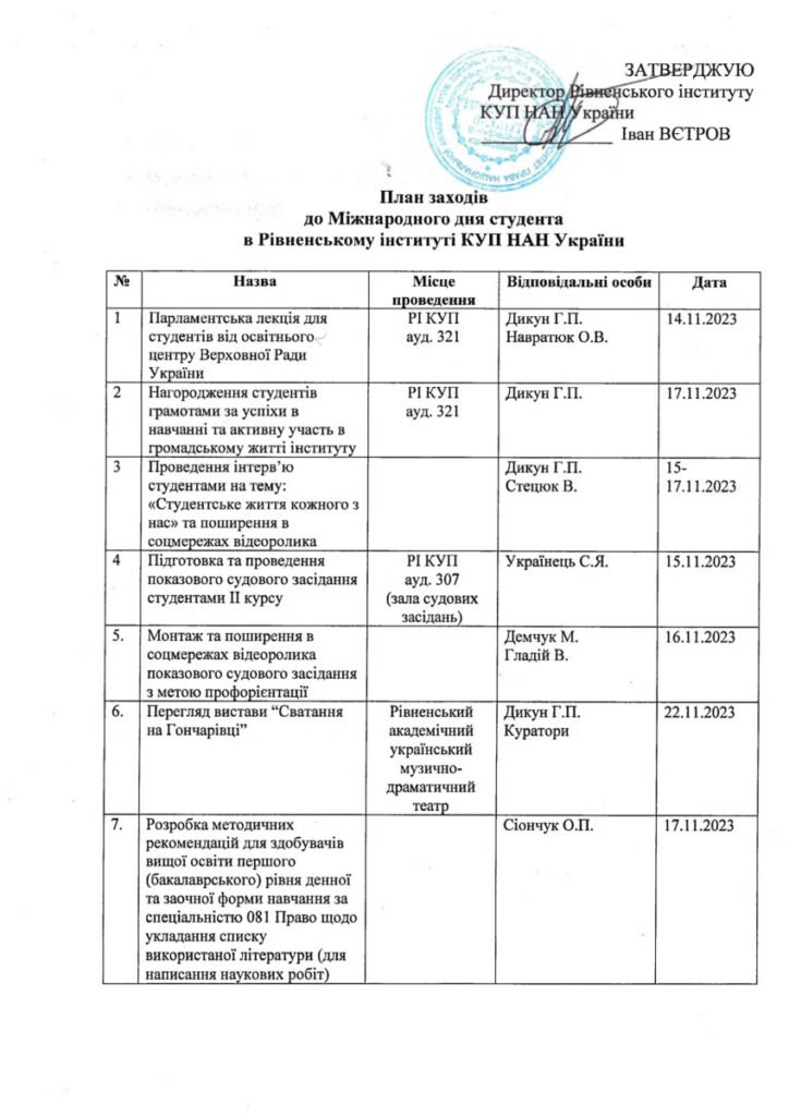 ПЛАН ЗАХОДІВ ДО МІЖНАРОДНОГО ДНЯ СТУДЕНТА В РІ КУП НАНУ