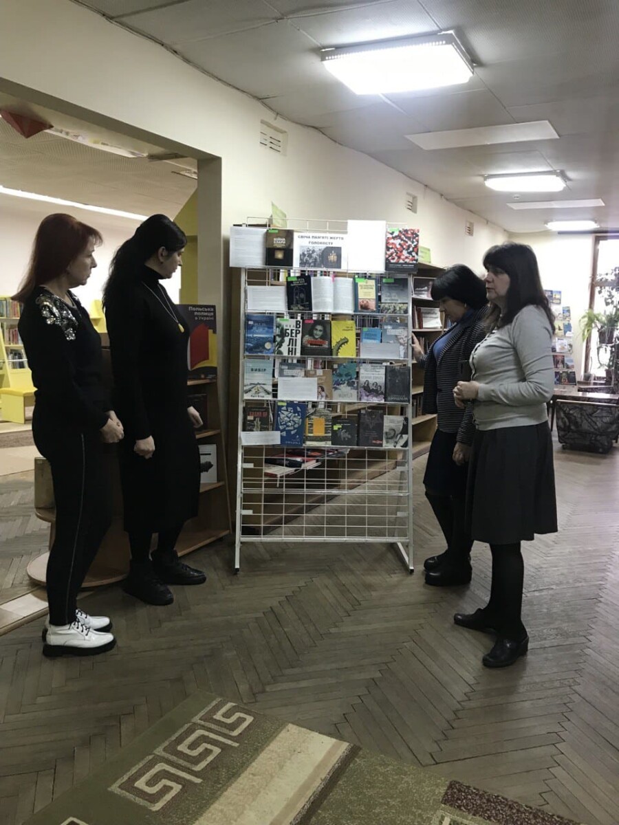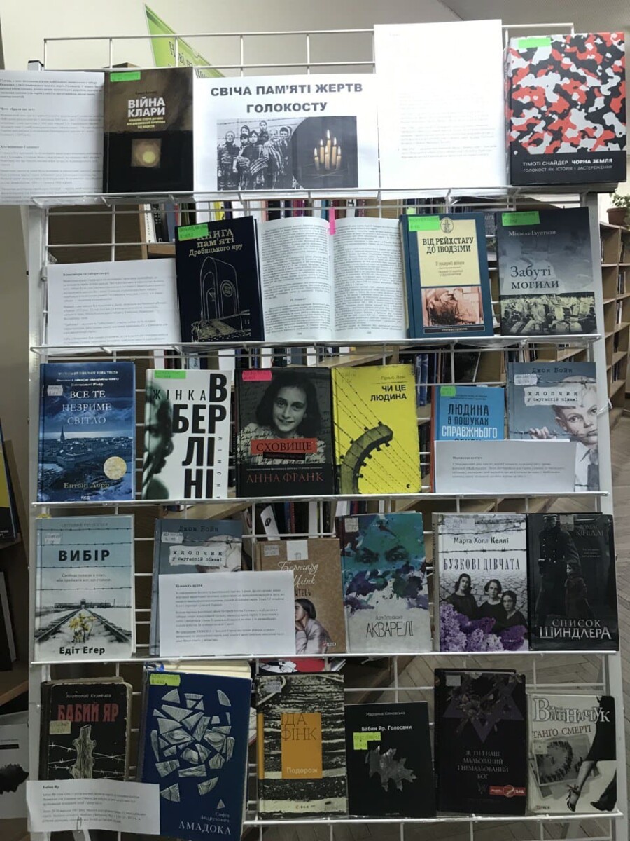 «Свіча пам’яті жертв Голокосту» – саме під такою назвою у відділі абонементу Рівненської обласної універсальної наукової бібліотеки експонована книжкова виставка до Міжнародного дня пам’яті жертв Голокосту. Провідний бібліотекар відділу Марина Гоярчук ознайомила працівників Рівненського інституту КУП НАН України з матеріалами виставки, що допомагають не лише осмислити події жахливої сторінки в історії людства, а й задуматись над новими підходами для збереження памʼяті про це, для поширення правди про геноциди, щоб уникнути їх нового й нового повторення.