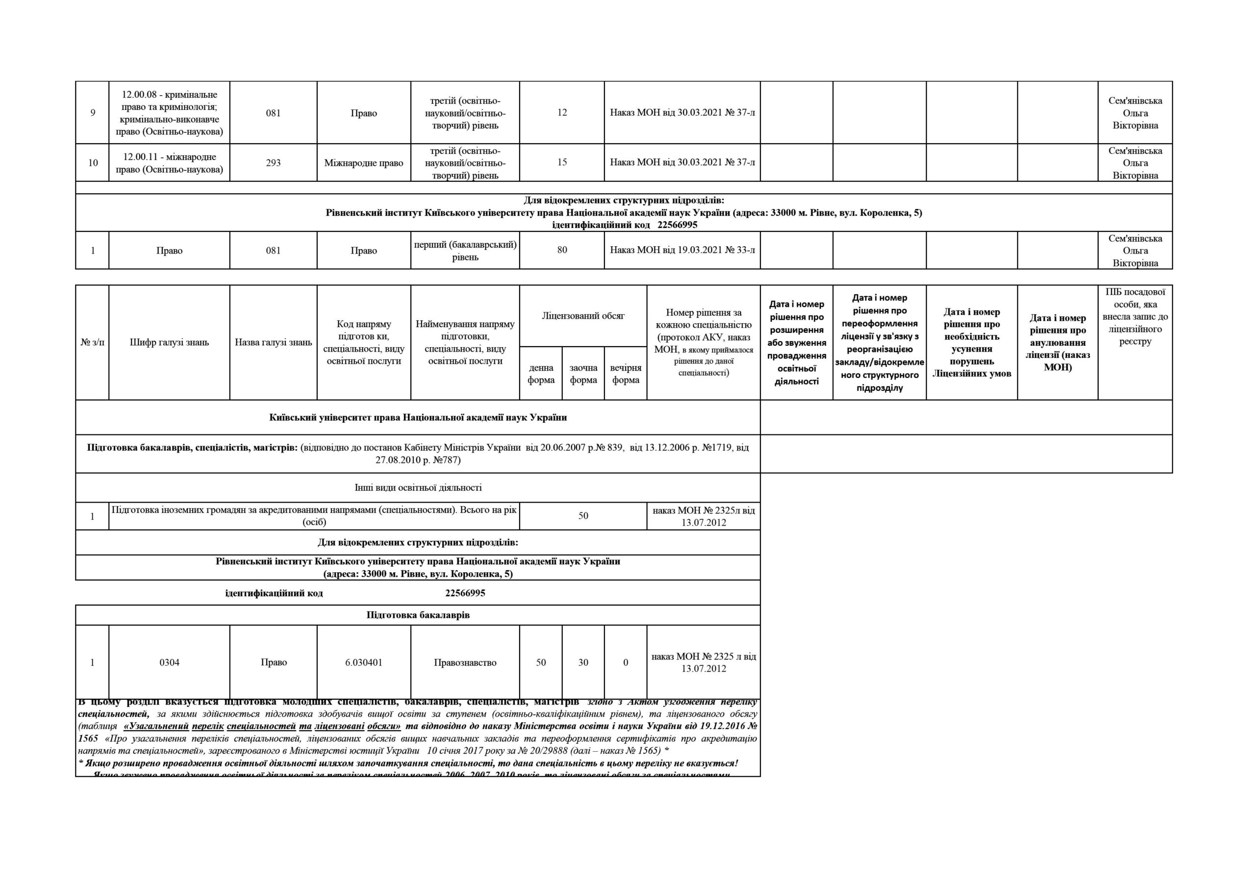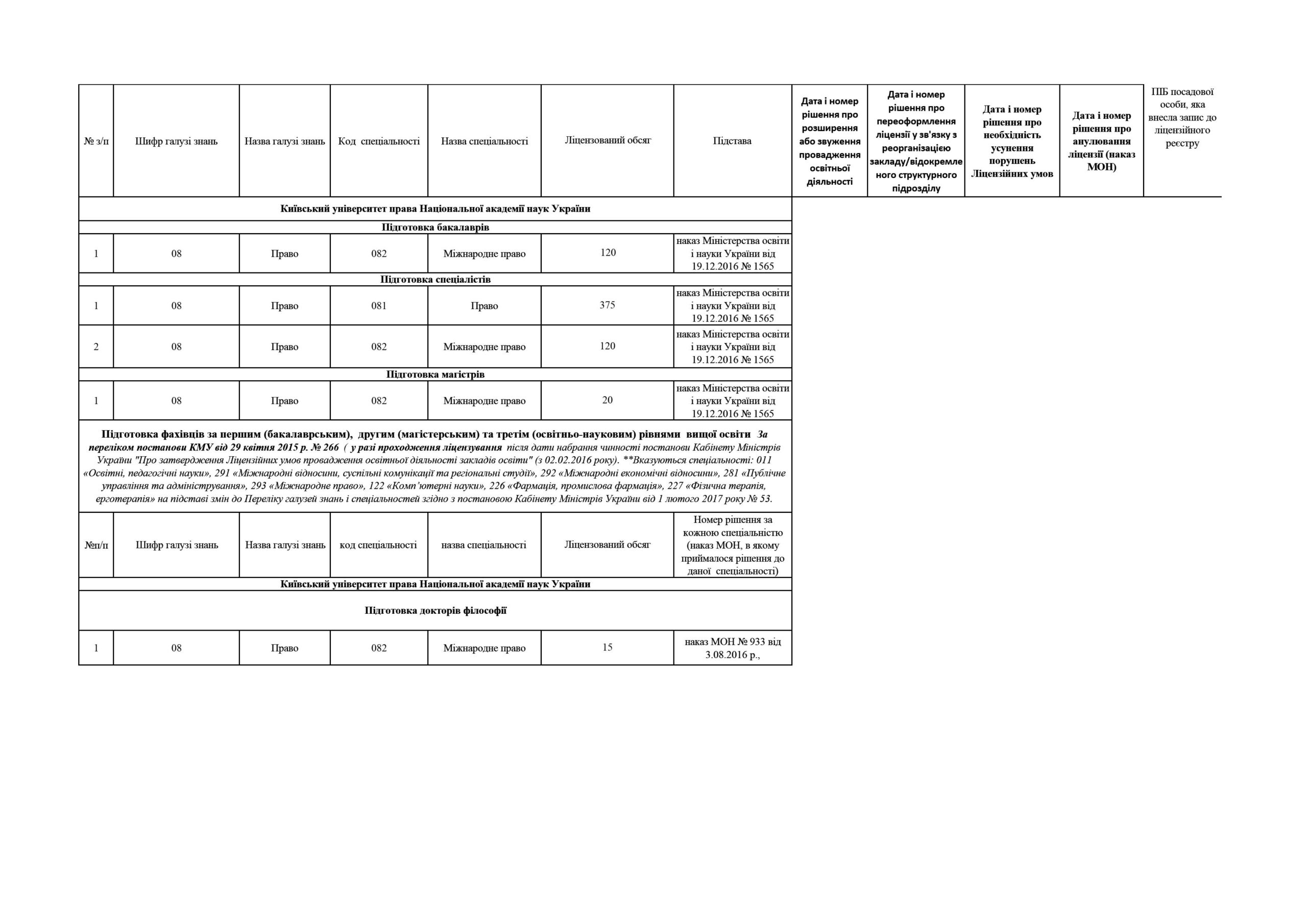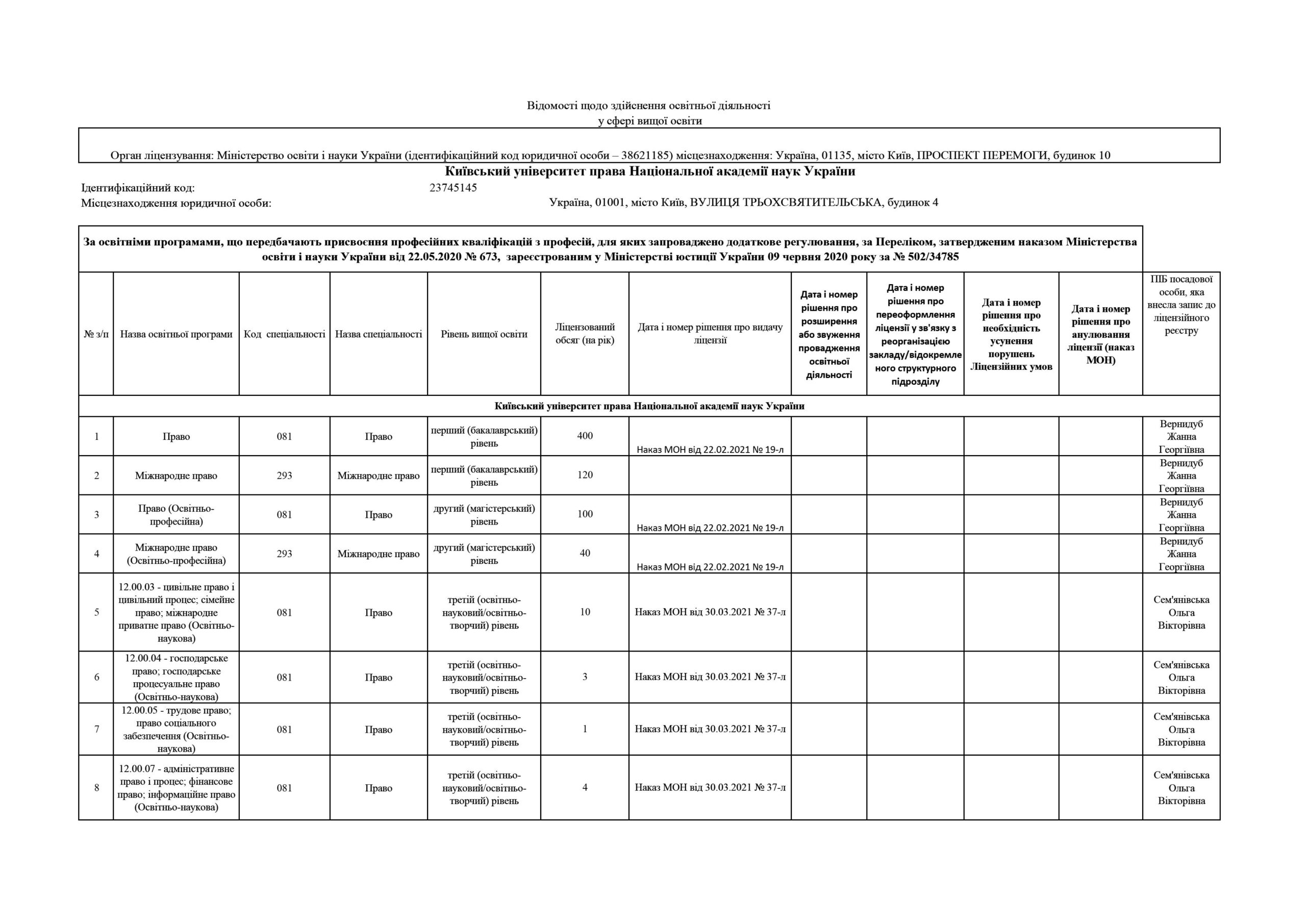 Відомості щодо здійснення освітньої діяльності у сфері вищої освіти Київським університетом права НАН України в Ліцензійному реєстрі суб’єктів освітньої діяльності у сфері вищої освіти: