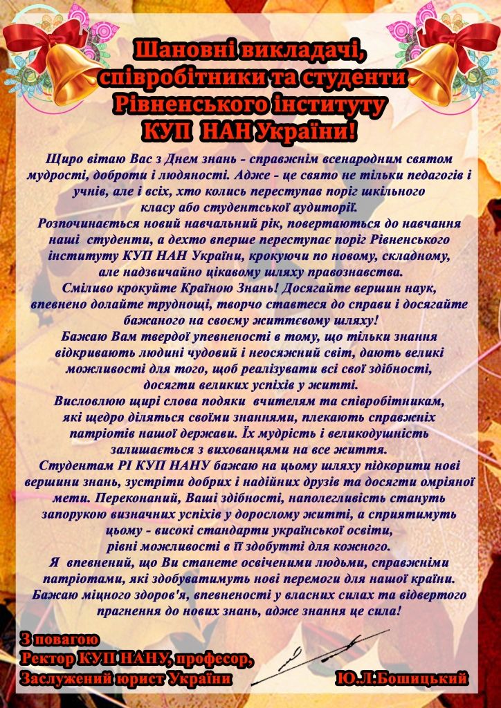 Привітання ректора КУП НАН України Ю.Л.Бошицького з Днем знань
