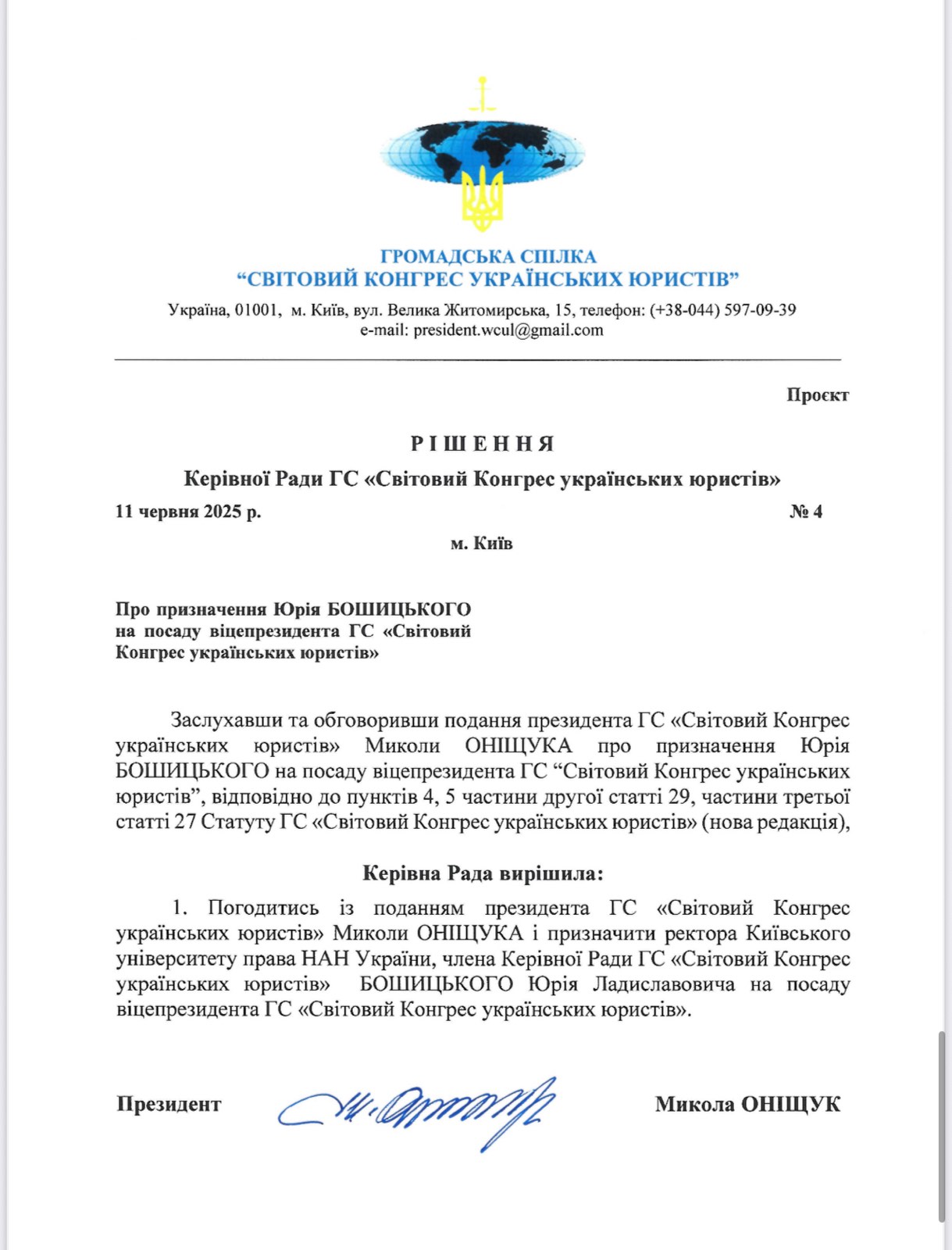 Одним із ключових рішень засідання стало одноголосне обрання ректора Київського університету права НАН України, професора Юрія Ладиславовича Бошицького на посаду віцепрезидента Світового Конгресу українських юристів.