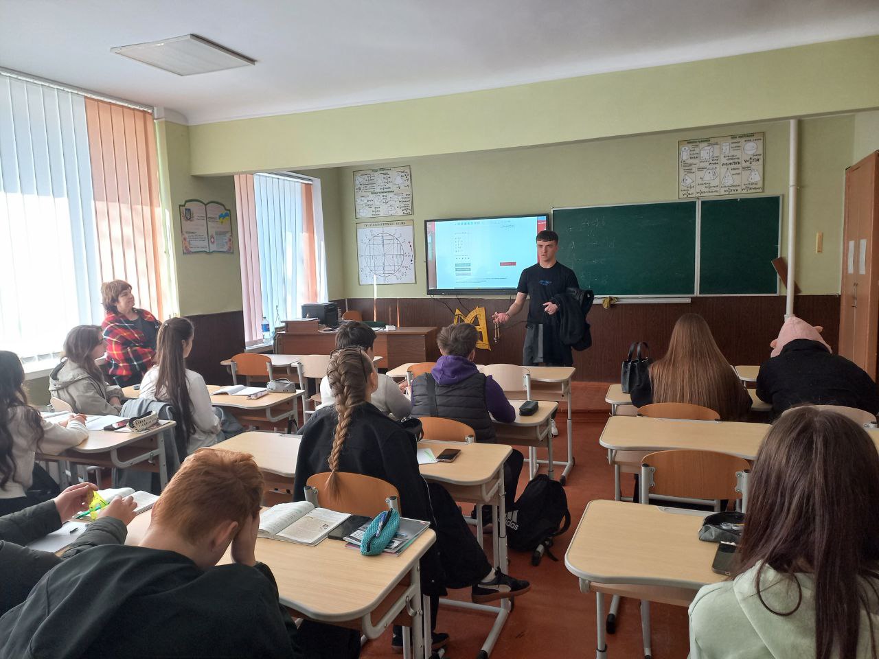 Про переваги навчання в інституті учням ліцею №9 розповіли викладач кафедри СЮД Юрій Дремлюга разом зі студентками ІІІ курсу Вікторією Василенко та Іриною Селецькою. Ліцеїсти дізналися про нюанси вступної кампанії, насичене студентське життя, можливості реалізації у науці, спорті та студентському самоврядуванні.