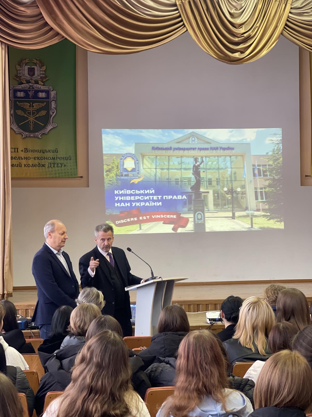 Перший візит Юрія Бощицького був до ВСП «Вінницький торговельно-економічний коледж ДТЕУ», де відбулася зустріч з керівництвом та студентами коледжу, під час якої керівник КУП НАНУ розповів про історію розвитку КУП НАНУ, кадровий потенціал, матеріально-технічним забезпечення, освітні проєкти та міжнародні зв‘язки університету. І саме головне, про можливість молоді отримати якісну юридичну освіту в університеті права.