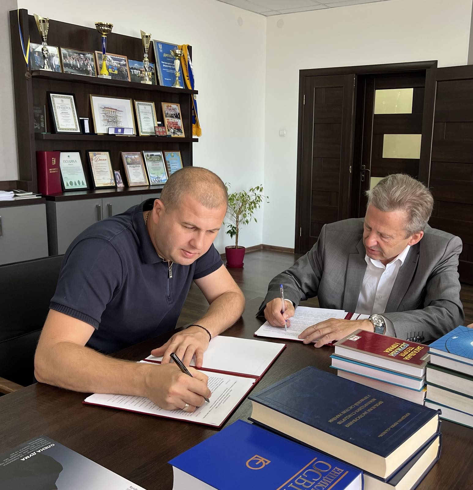 Під час робочої поїздки на Закарпаття ректора Київського університету права Національної академії наук України проф. Юрія Бошицького відбулася зустріч з головою Ужгородської районної ради Юрієм Фрінцком. У зустрічі взяли участь також керівник Ужгородського Науково-консультативного центру КУП НАНУ Іван Ващинець і керуючий справами виконавчого апарату Ужгородської районної ради Віктор Шелельо. Учасники обговорили наявні в Ужгородському районі проблеми у сфері освіти, а також визначили перспективні напрямки співпраці між університетом і районною радою. Досягнуті домовленості були зафіксовані в підписаній керівниками угоді про співробітництво між КУП НАНУ та Ужгородською районною радою. Зокрема, в сторони дійшли згоди про здійснення взаємовигідної співпраці з метою підтримання місцевих закладів освіти та забезпечення доступу їх учнів до якісної правничої освіти, визначили можливості надання консультаційної допомоги вразливим категоріям населення, зокрема, ветеранам, силами юридичної клініки та науково-викладацького складу університету тощо.