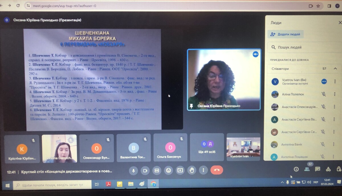 Завідувач кафедри спеціальних юридичних дисциплін РІ КУП НАН України Віктор Ткачук («Тарас Шевченко — виразник української національної ідентичності»); кандидатка педагогічних наук, доцентка, завідувачка кафедри української мови та літератури ПВНЗ «Міжнародний економіко-гуманітарний університет імені академіка Степана Дем’янчука»Лілія Овдійчук («Просвітянська Шевченкіна у контексті формування національної ідентичності українців»);