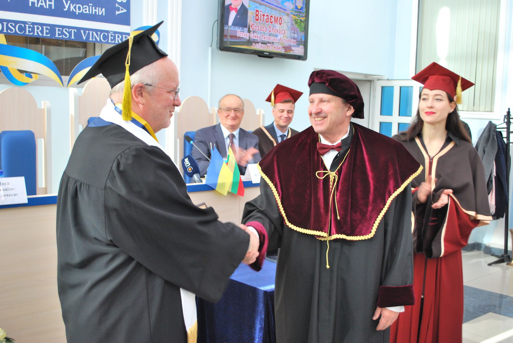 Серед почесних гостей, які взяли участь у розширеному засіданні Вченої ради, особливе місце посів віцепрезидент Національної академії наук України Олег Олексійович Рафальський. У своєму виступі він наголосив на важливості міждержавної наукової співпраці, підкресливши, що подібні події є не лише виявом глибокої поваги до видатних діячів сучасності, а й потужним сигналом єдності академічних спільнот України та Литви. Академік Рафальський відзначив, що присвоєння звання Doctor Honoris Causa пану Юозасу Олекасу є символом вдячності за його особистий внесок у зміцнення гуманітарних, освітніх і наукових зв’язків між нашими країнами, а також проявом високої шани з боку української наукової спільноти. Олег Олексійович передав спікеру пам’ятний подарунок та слова вдячності від Президента НАН України, академіка Анатолія Глібовича Загороднього за підтримку Національної академії наук України литовськими науковцями, висловивши найщиріші побажання подальших успіхів у справі розвитку дружніх українсько-литовських відносин.