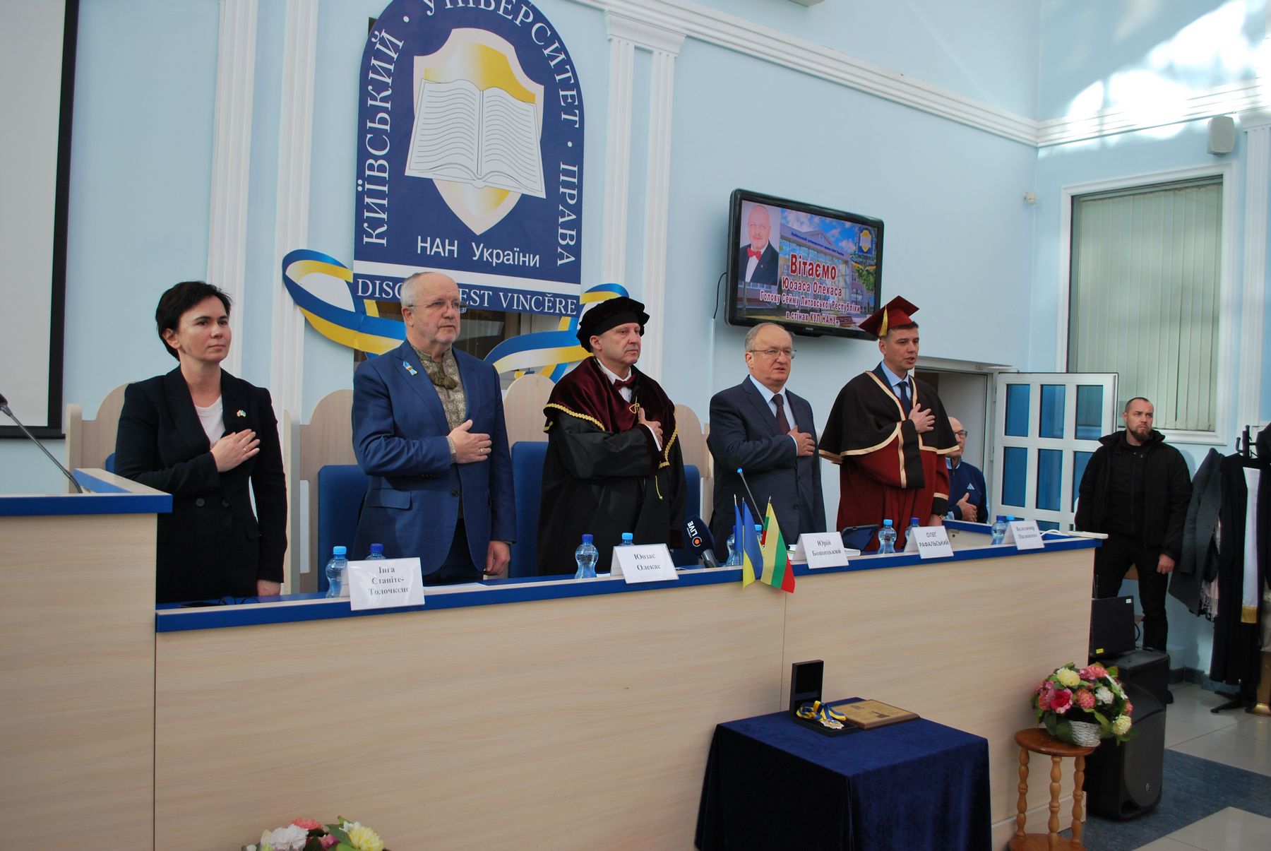 Київському університеті права НАН України відбулася знаменна подія − візит Голови Сейму Литовської Республіки пана Юозаса Олекаса, який відвідав університет з гостьовою лекцією для здобувачів вищої освіти та науково-педагогічного складу КУП НАН України. Поважний гість також взяв участь у розширеному засіданні Вченої ради, під час якого йому було урочисто присвоєно почесне звання Doctor Honoris Causa Київського університету права НАН України.