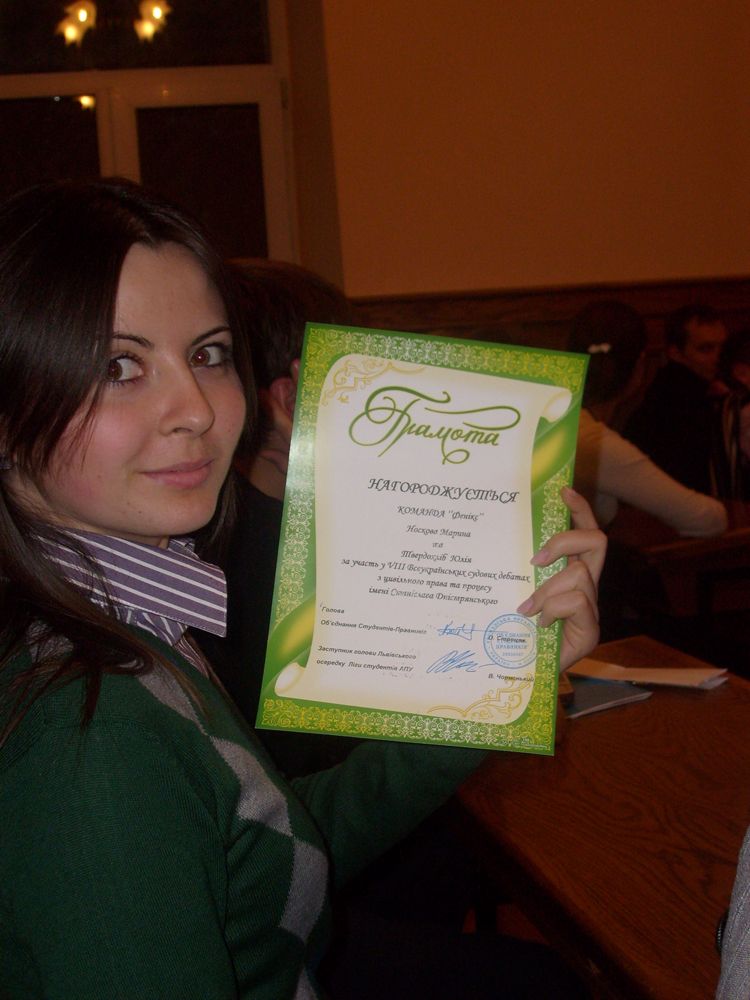 Студенти-консультанти Юридичної клініки “Фенікс” (Носкова Марина 5-й курс, Твердохліб Юлія 4-й курс) взяли участь у VIII Всеукраїнських судових дебатах з цивільного права та процесу що відбулися 28-29 жовтня 2009 р. на базі кафедри цивільного права та процесу юридичного факультету Львівського національного університету імені Івана Франка у м. Львів.