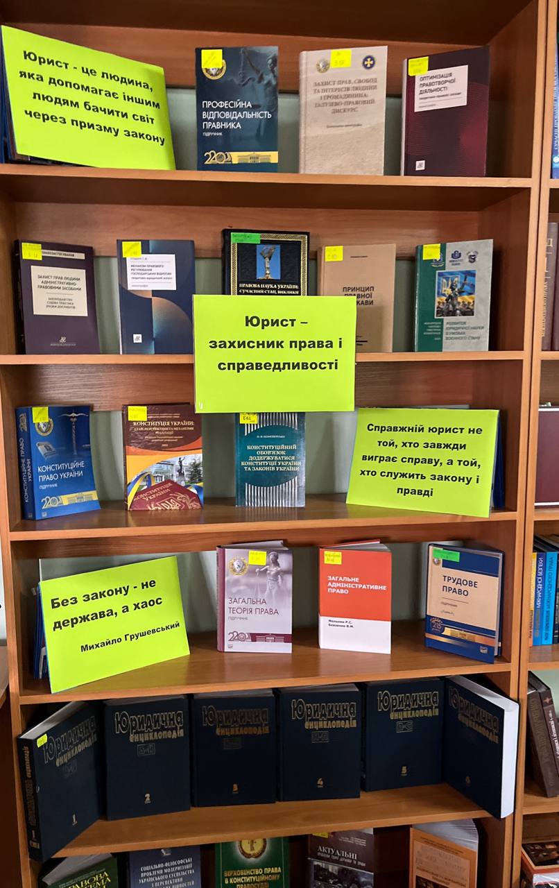 Завідувачка бібліотеки Ольга Дем’янчук наголосила, що подібні виставки – це не лише джерело знань, а й потужний інструмент формування правосвідомості майбутніх юристів. Вони допомагають глибше зрозуміти суть професії юриста як захисника прав, свобод і законних інтересів громадян, розширити правову ерудицію, а ще сприяють популяризації спеціалізованої літератури, яка висвітлює етику, відповідальність і місію юриста у сучасному суспільстві.