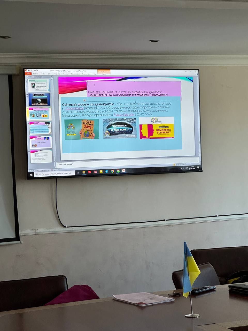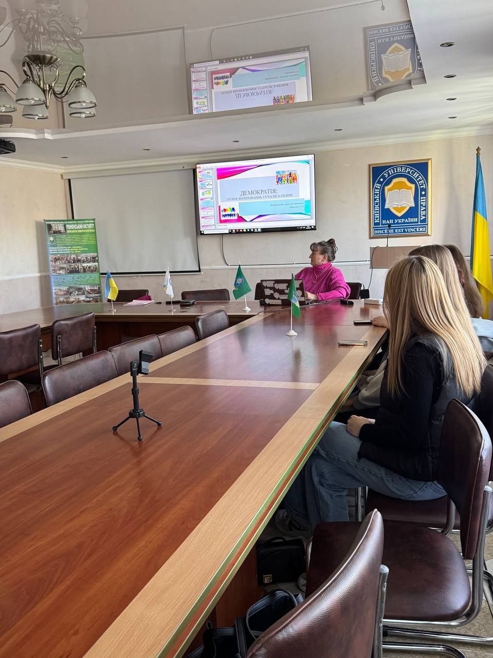 Лекція була присвячена Міжнародному дню демократії. Її прочитала доктор соціологічних наук Олеся Кириленко, яка розглянула основні теоретичні напрями дослідження демократії, її принципів, факторів формування, проблем і перспектив розвитку у сучасних країнах світу. Значний інтерес викликав матеріал щодо індексів демократії, які представляють технології вимірювання рівня розвитку демократії в різних країнах світу. Так, Україна нині входить до складу країн, у яких відбувається транзит від автократії до демократії. Отже, демократичний курс розвитку, який обрало українське суспільство на початку своєї незалежності має допомогти подолати труднощі війни та повоєнного відновлення з перспективою переходу до періоду розвиненої демократії.