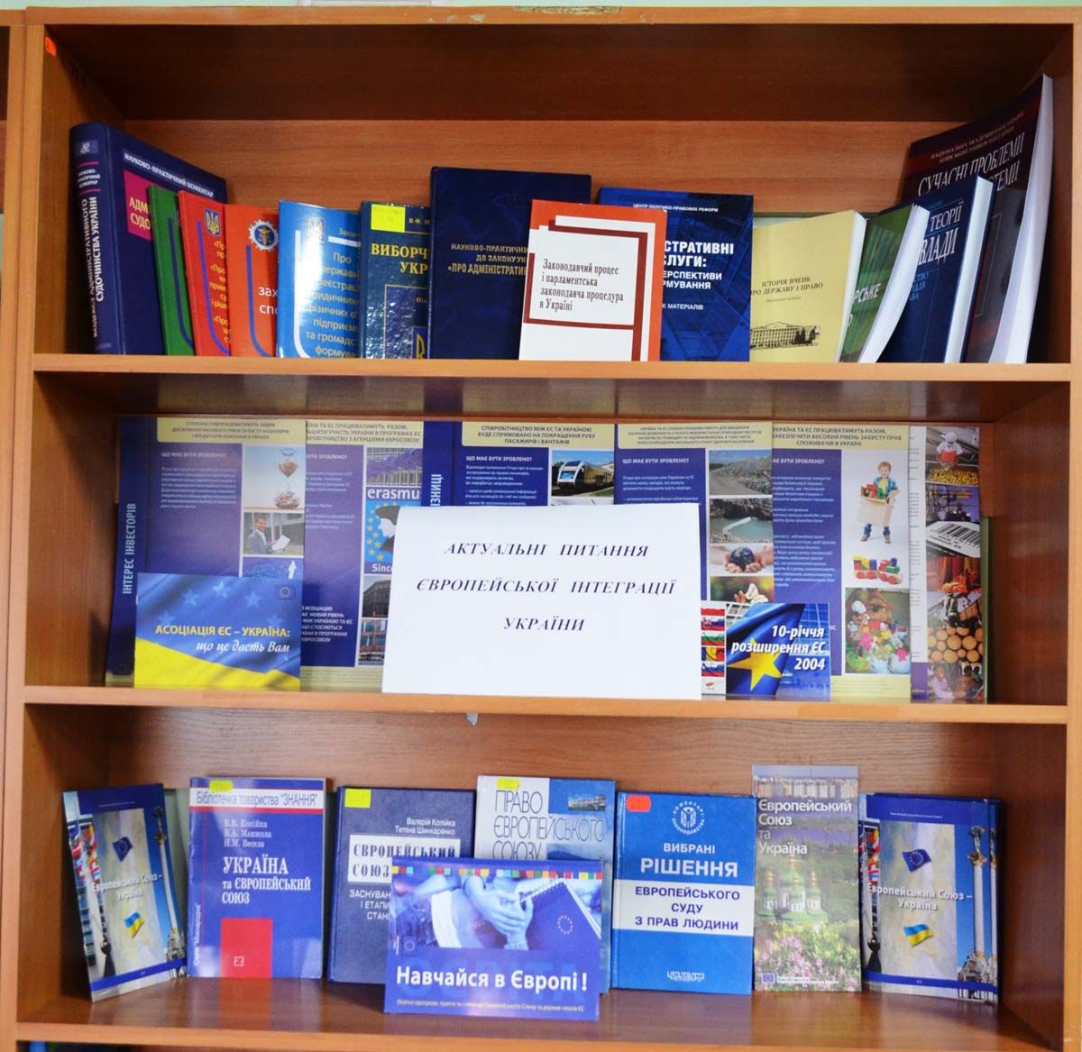 На виставці представлені зібрання міжнародних договорів та основоположних актів Європейського Союзу, матеріали міжнародних «круглих столів» та науково-практичних конференцій, підручники, монографії, які присвячені розгляду проблем європейської інтеграції України до Євросоюзу у сферах економіки, політики, права, інформації, а також видання, в яких йдеться про розвиток та функціонування конституційно-правового забезпечення участі України та інших держав у процесах європейської міждержавної інтеграції.