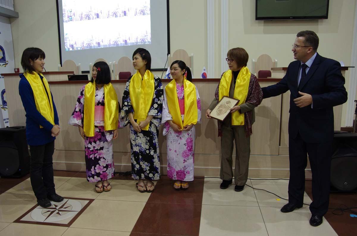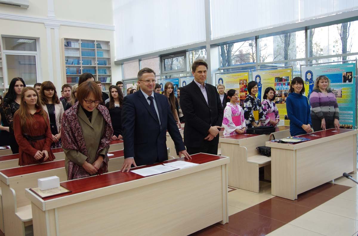 До присутніх звернувся ректор, професор, заслужений юрист України, заступник голови Союзу юристів України, відповідальний секретар комісії Конституційної асамблеї з питань прав, свобод та обов`язків людини і громадянина, «Посол миру» – Юрій Ладиславович Бошицький. Він зробив екскурс у історію походження Міжнародного дня студента (1941) та Дня студента в Україні (1999). Молодь завжди намагається бути мудрою та успішною, креативною, тож хай студентські роки будуть насиченими приємними подіями, цікавими зустрічами, як сьогодні – волонтери із Японії, які обміняються досвідом волонтерської діяльності, елементами культурних студентських традицій Японії та України.
