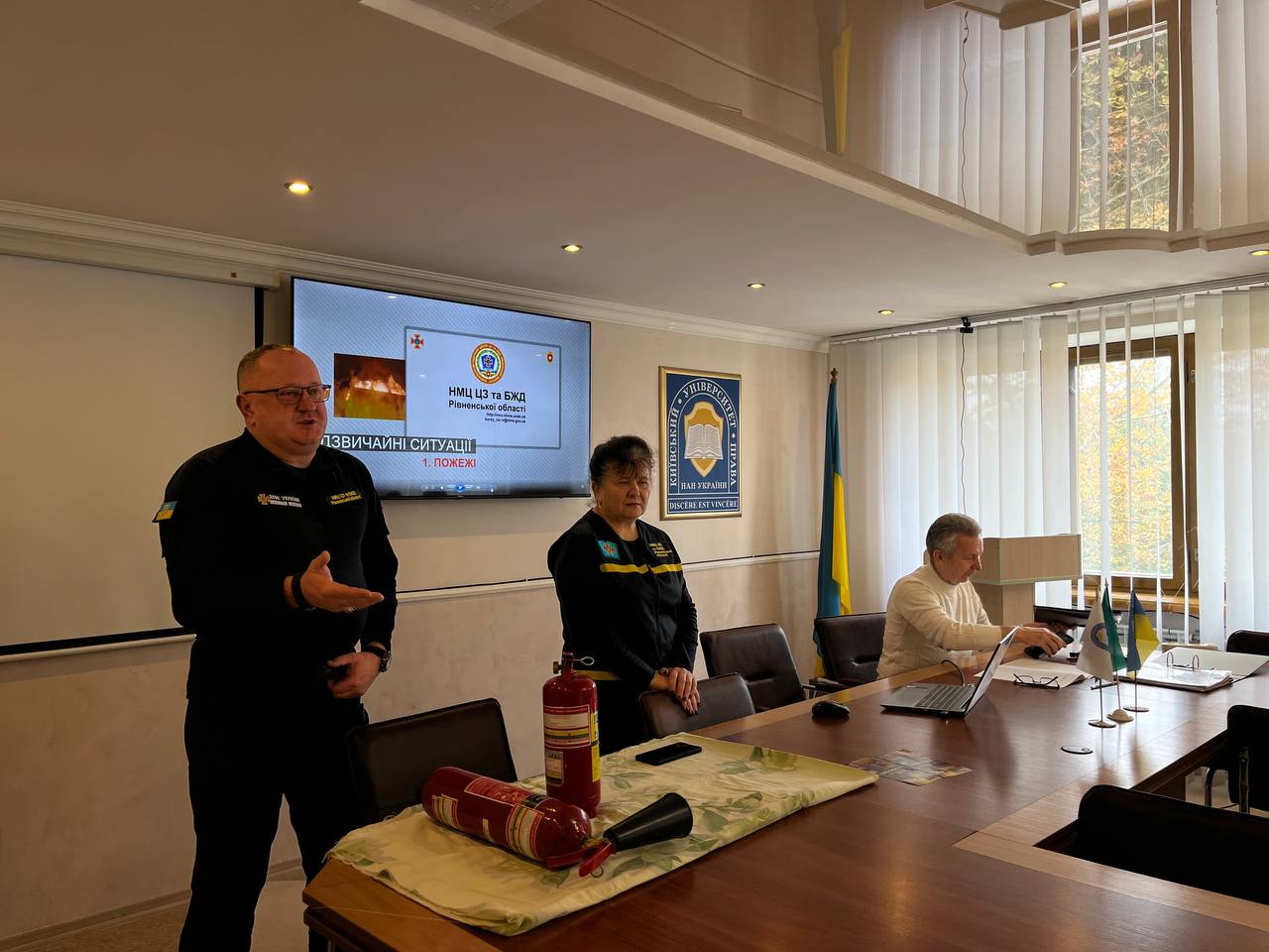 Кваліфіковану інформацію за означеною проблематикою студентам та працівникам закладу надали фахівці центру Валентина Приступлюк та Андрій Мощук, які наголосили на тому, що у сучасному світі, який динамічно змінюється, питання безпеки та цивільного захисту набувають першочергового значення. Вони стосуються кожного – від студента до керівника, від звичайного громадянина до науковця, а тому ознайомлення з ключовими практиками у сфері безпеки життєдіяльності та пожежної безпеки є не просто актуальним, а життєво необхідним. Аргументація експертів супроводжувалася переглядом відеороликів.