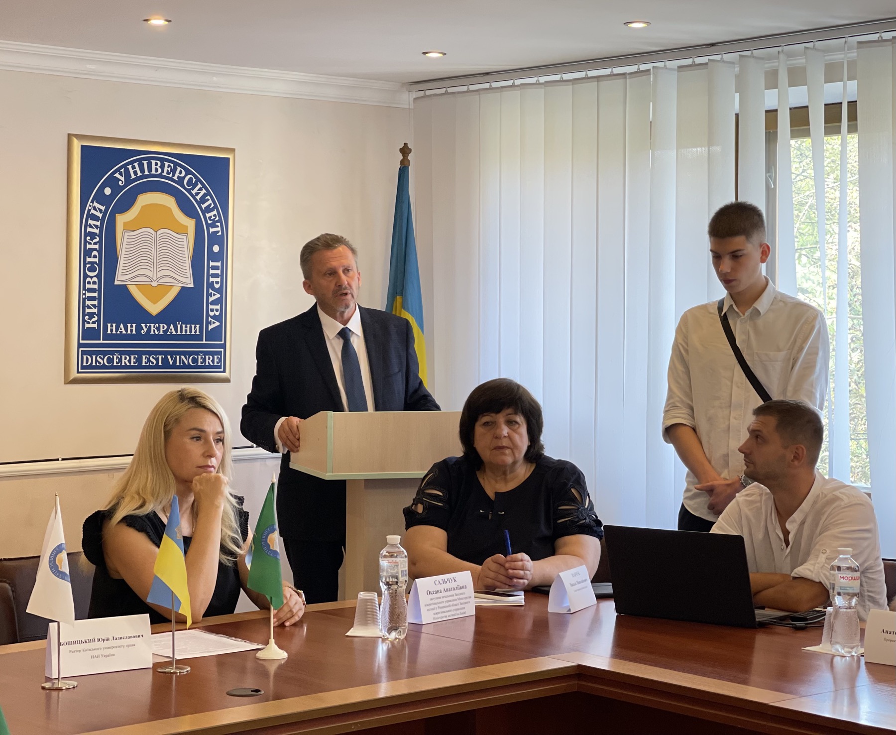 Юрій Бошицький представив почесну делегацію Київського університету права НАН України у складі доктора юридичних наук, проректора з наукової роботи Іван Кайла, доктора юридичних наук, професора, завідувача кафедри спеціальних юридичних дисциплін РІ КУП НАНУ Руслана Чорнолуцького, проректора з адміністративної роботи КУП НАНУ Анатолія Маркевича, завідувачки наукової бібліотеки КУП НАНУ Тетяни Ярошевської. Ректор наголосив на тому, що цього року удосконалено кадрову політику в РІ КУП НАНУ: кафедри інституту очолили доктори наук, відомі у науковому світі дослідники Руслан Чорнолуцький та Олеся Кириленко, запрошено багатьох юристів-практиків, що, безумовно, сприятиме посиленню фахового потенціалу інституту.