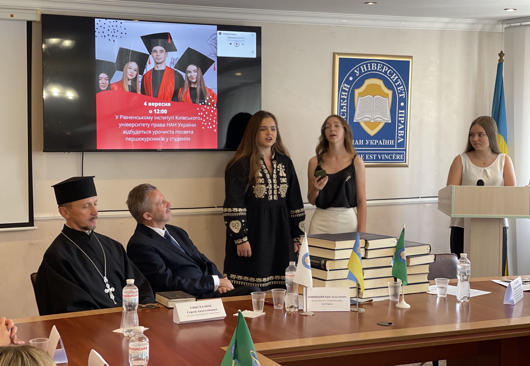 Зворушливі привітання першокурсникам адресували як представники базового закладу, так і почесні гості, зокрема заступник голови Рівненської обласної ради Сергій Свисталюк, керівниця Комунальної установи «Центр професійного розвитку педагогічних працівників» Рівненської міської ради Мирослава Жовтан, заступниця директора з наукової роботи Рівненського обласного краєзнавчого музею Оксана Яремчук, регіональна координаторка Західного міжрегіонального управління Міністерства юстиції Оксана Сальчук, випускник інституту адвокат Денис Михалевич, священник православної церкви України о. Володимир та ін.