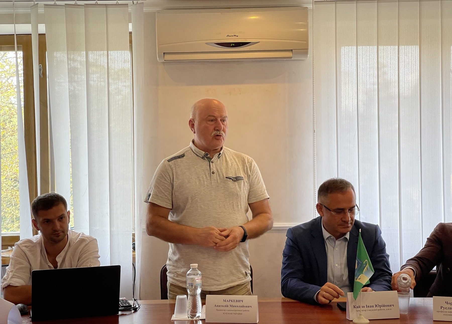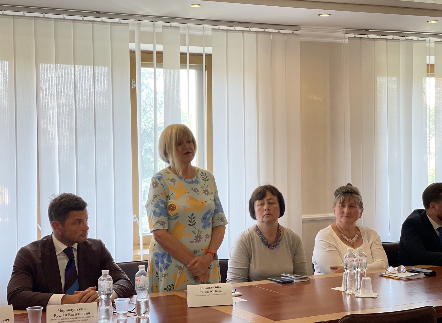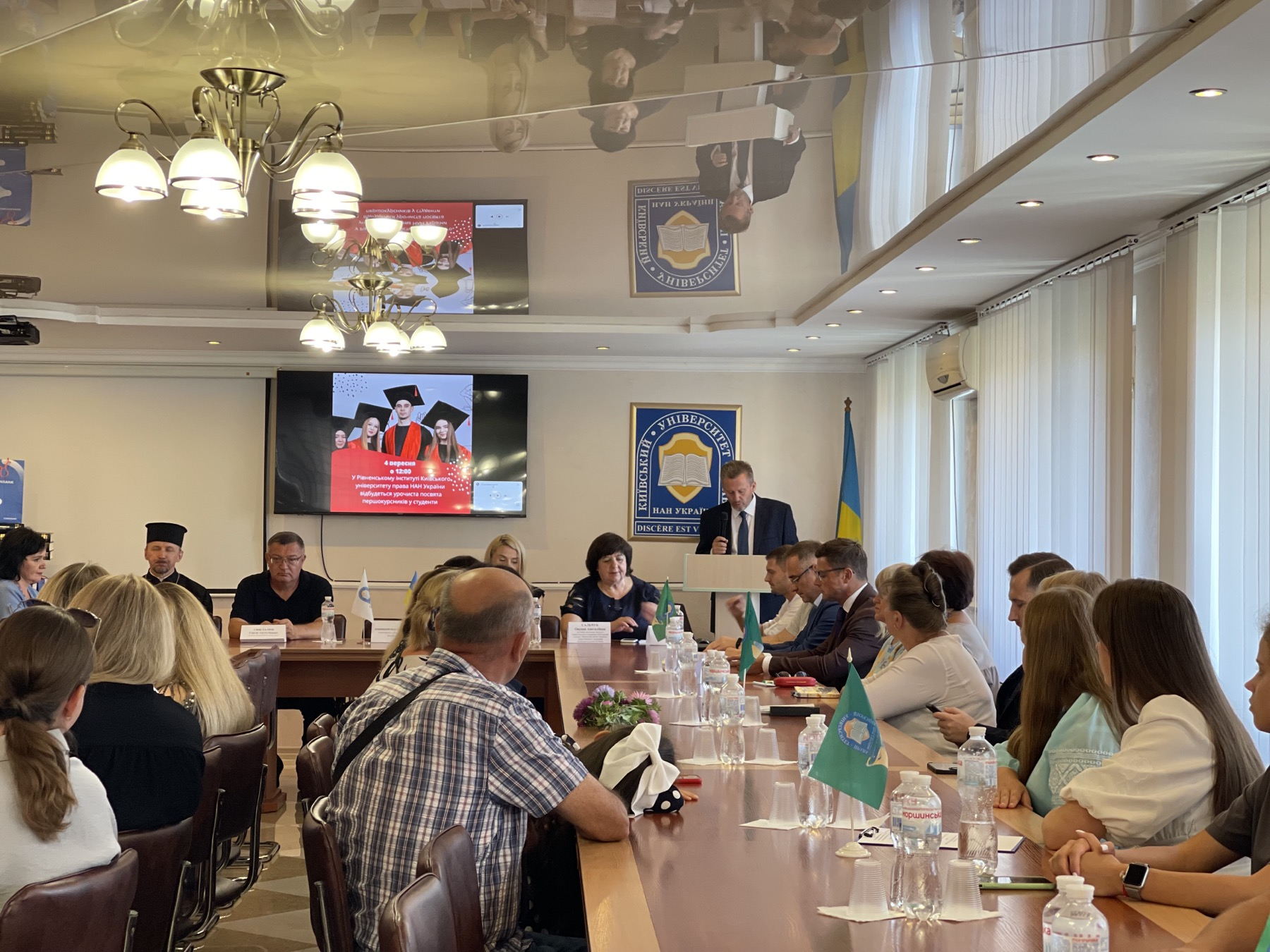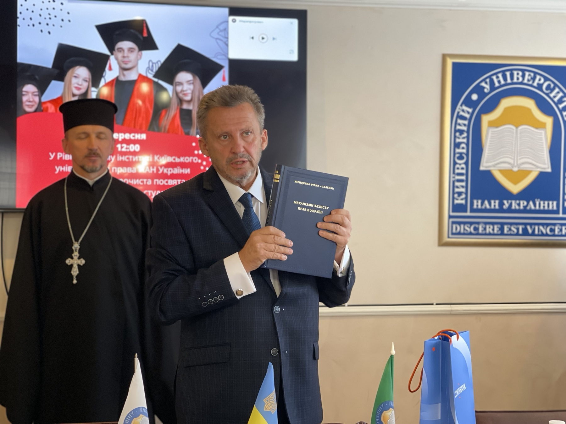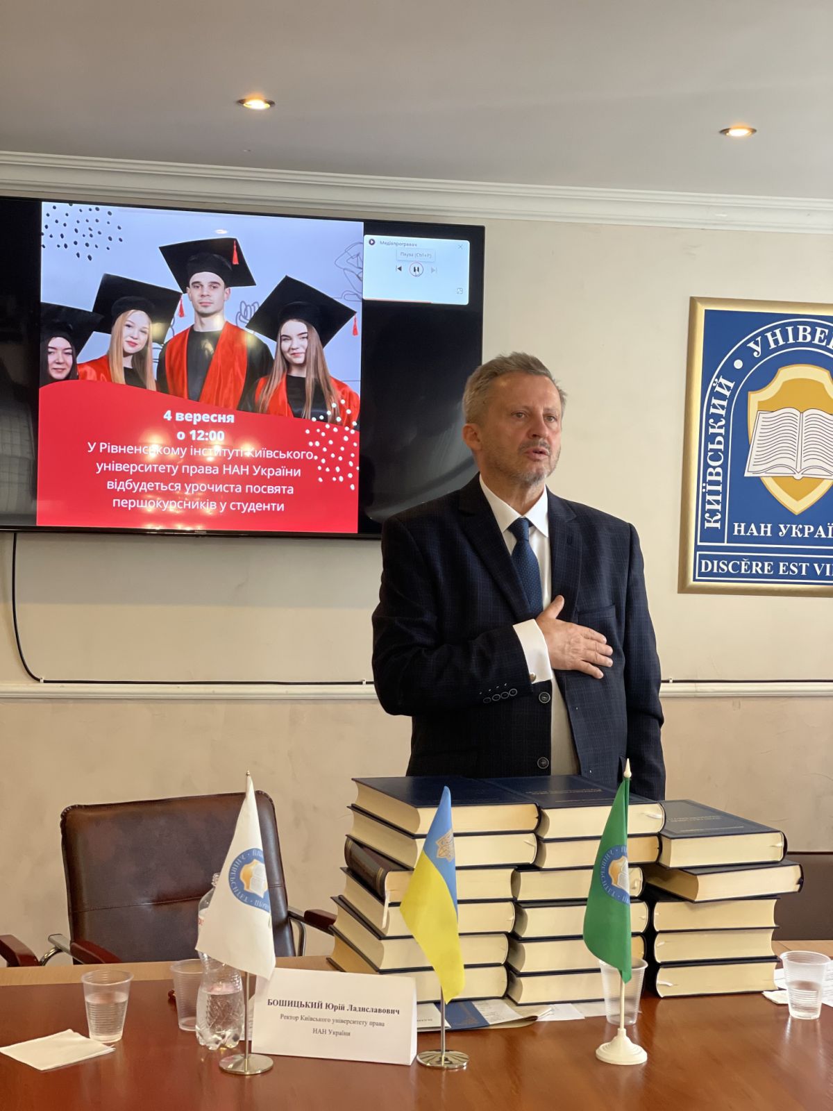 Юрій Бошицький представив почесну делегацію Київського університету права НАН України у складі доктора юридичних наук, проректора з наукової роботи Іван Кайла, доктора юридичних наук, професора, завідувача кафедри спеціальних юридичних дисциплін РІ КУП НАНУ Руслана Чорнолуцького, проректора з адміністративної роботи КУП НАНУ Анатолія Маркевича, завідувачки наукової бібліотеки КУП НАНУ Тетяни Ярошевської. Ректор наголосив на тому, що цього року удосконалено кадрову політику в РІ КУП НАНУ: кафедри інституту очолили доктори наук, відомі у науковому світі дослідники Руслан Чорнолуцький та Олеся Кириленко, запрошено багатьох юристів-практиків, що, безумовно, сприятиме посиленню фахового потенціалу інституту.
