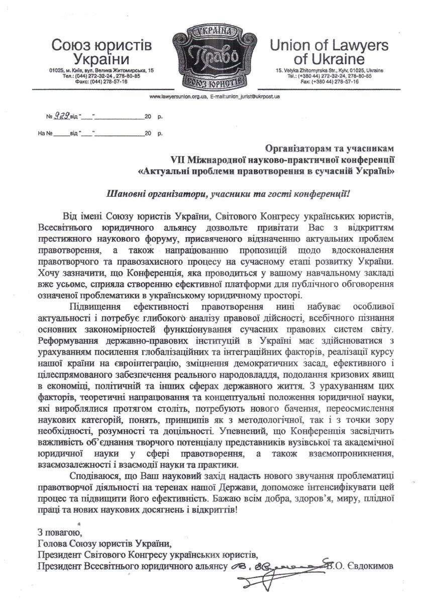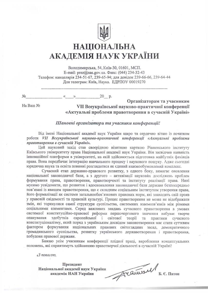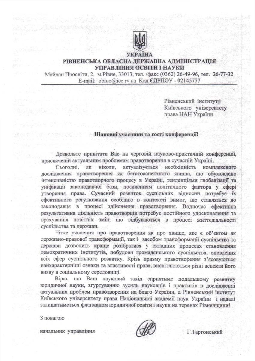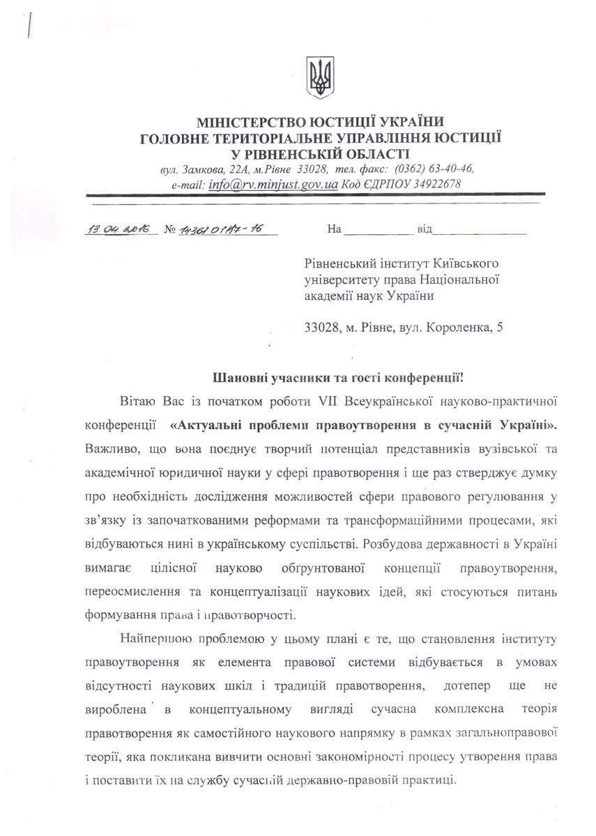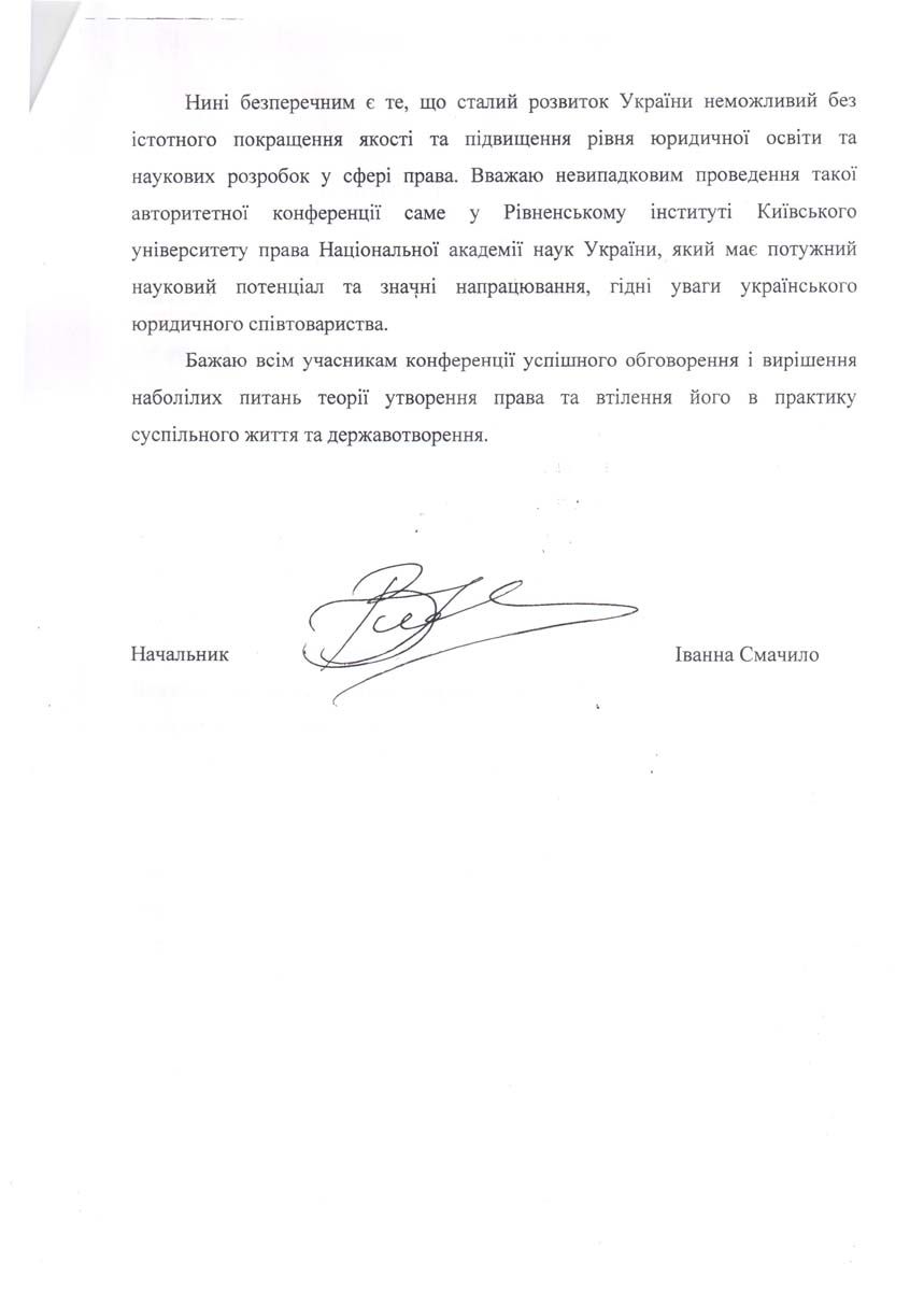 З вітальним словом звернулися до присутніх почесні гості конференції, зокрема заступник голови обласної ради Олексій Андрійович Бучинський, начальник управління освіти і науки Рівненської обласної державної адміністрації Григорій Миколайович Таргонський, начальник Головного територіального управління юстиції в Рівненській області Іванна Василівна Смачило. «Вважаю невипадковим проведення такої авторитетної конференції саме у Рівненському інституті Київського університету права Національної академії наук України, який під керівництвом Юрія Ладиславовича Бошицького примножив свій науковий потенціал і має значні напрацювання, гідні уваги українського юридичного співтовариства», ? зазначила Іванна Василівна Смачило.