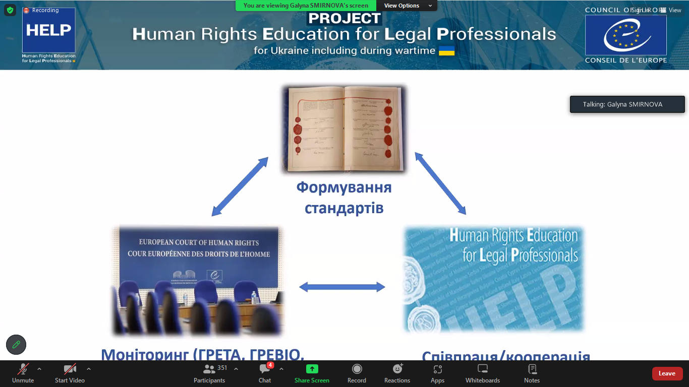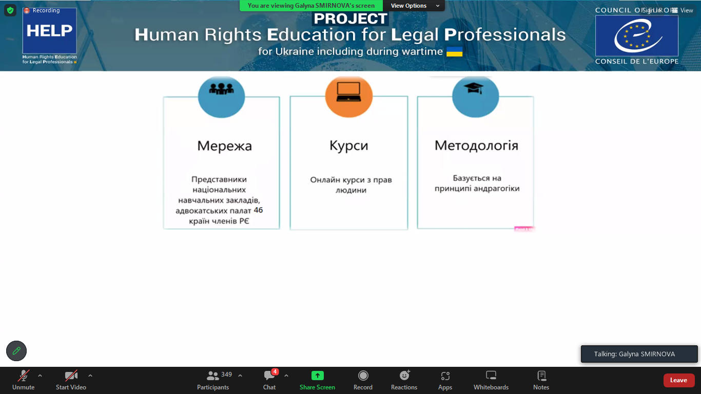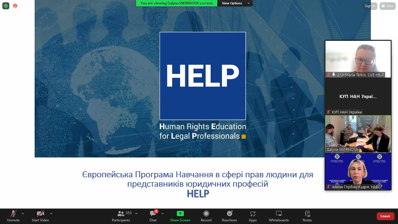 18 червня 2024 року представники Київського університету права НАН України на чолі з проректоркою з навчально методичної роботи Оленою АНТОНОВОЮ прийняли участь в онлайн-презентації «Стратегії впровадження курсів HELP до освітнього процесу закладів вищої освіти України» організованої Міністерством освіти і науки України разом з проєктом Ради Європи «HELP (Освіта в галузі прав людини для юристів) для України в тому числі під час війни».