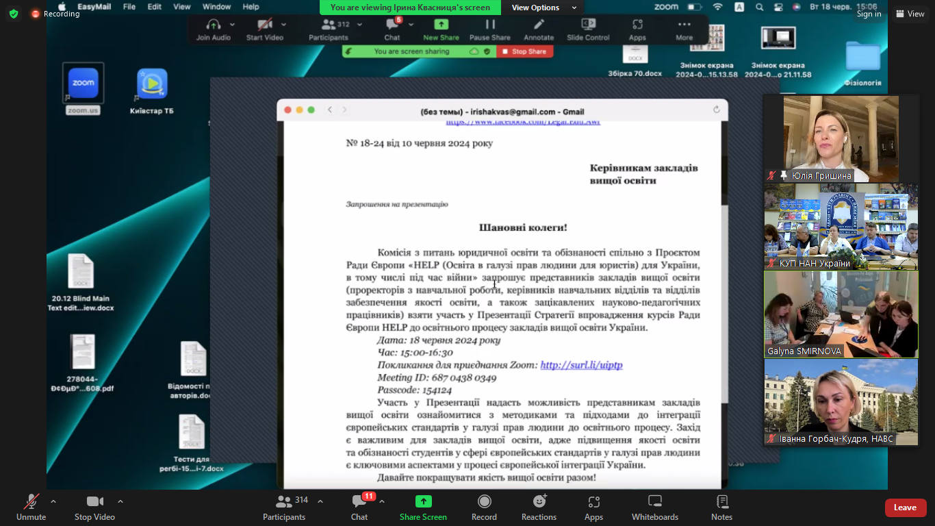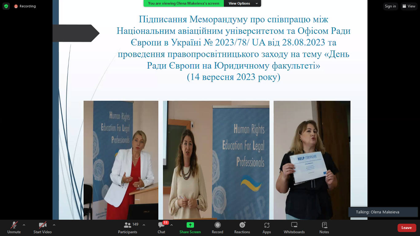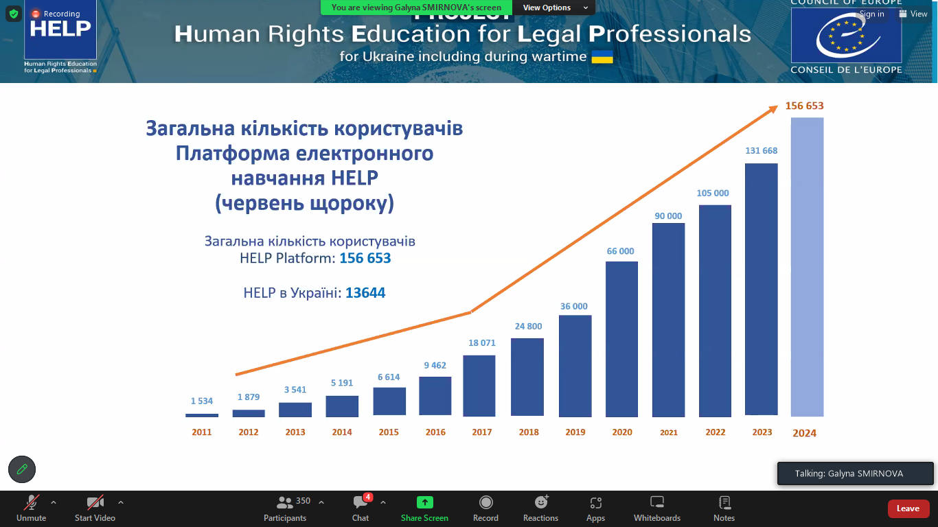 18 червня 2024 року представники Київського університету права НАН України на чолі з проректоркою з навчально методичної роботи Оленою АНТОНОВОЮ прийняли участь в онлайн-презентації «Стратегії впровадження курсів HELP до освітнього процесу закладів вищої освіти України» організованої Міністерством освіти і науки України разом з проєктом Ради Європи «HELP (Освіта в галузі прав людини для юристів) для України в тому числі під час війни».