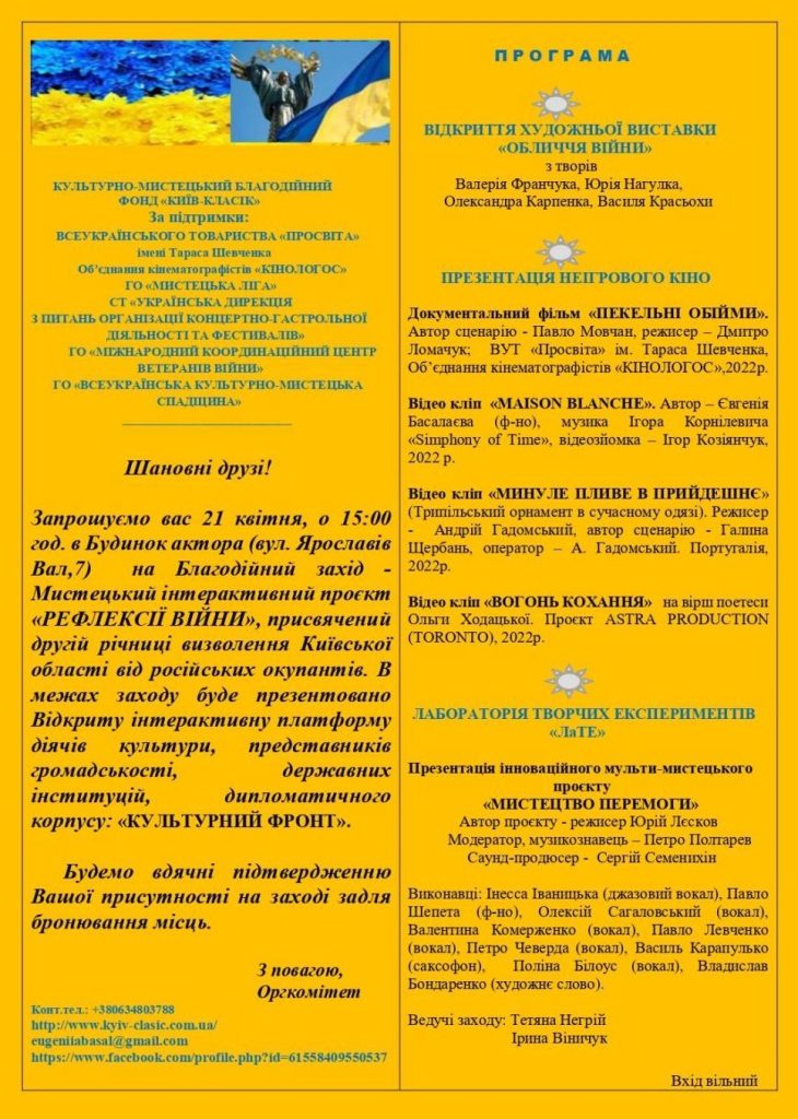 У програмі Мистецького інтерактивного проєкту «РЕФЛЕКСІЇ ВІЙНИ» було презентовано Відкриту інтерактивну платформу діячів культури, представників громадськості, державних інституцій, дипломатичного корпусу «Культурний фронт»: