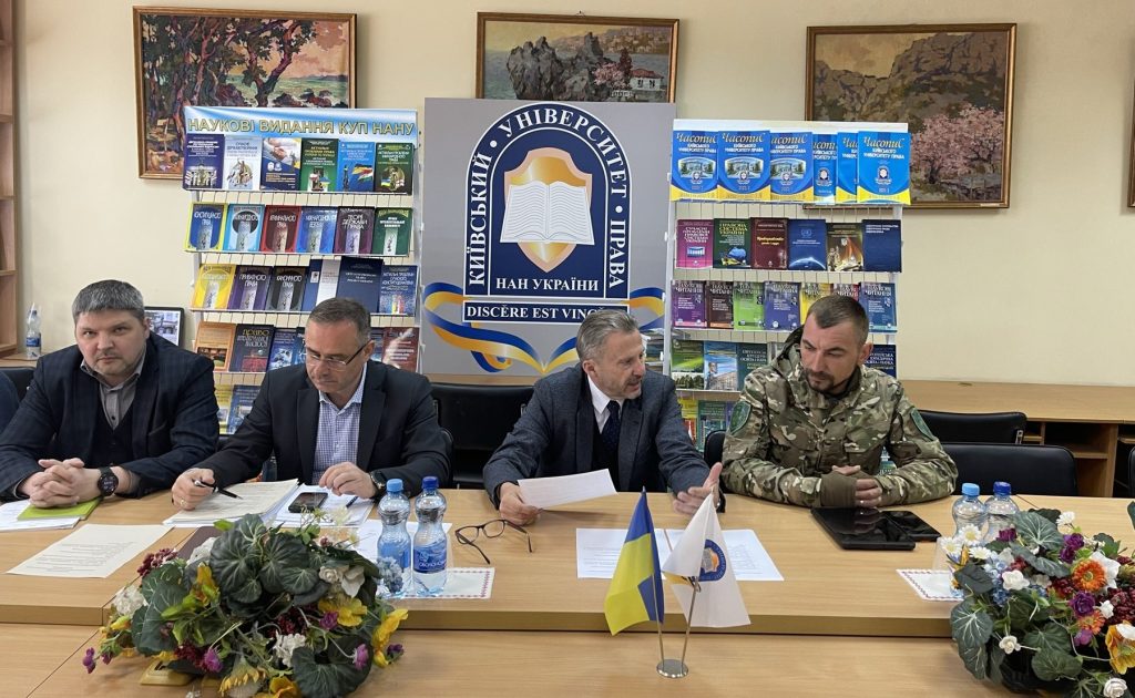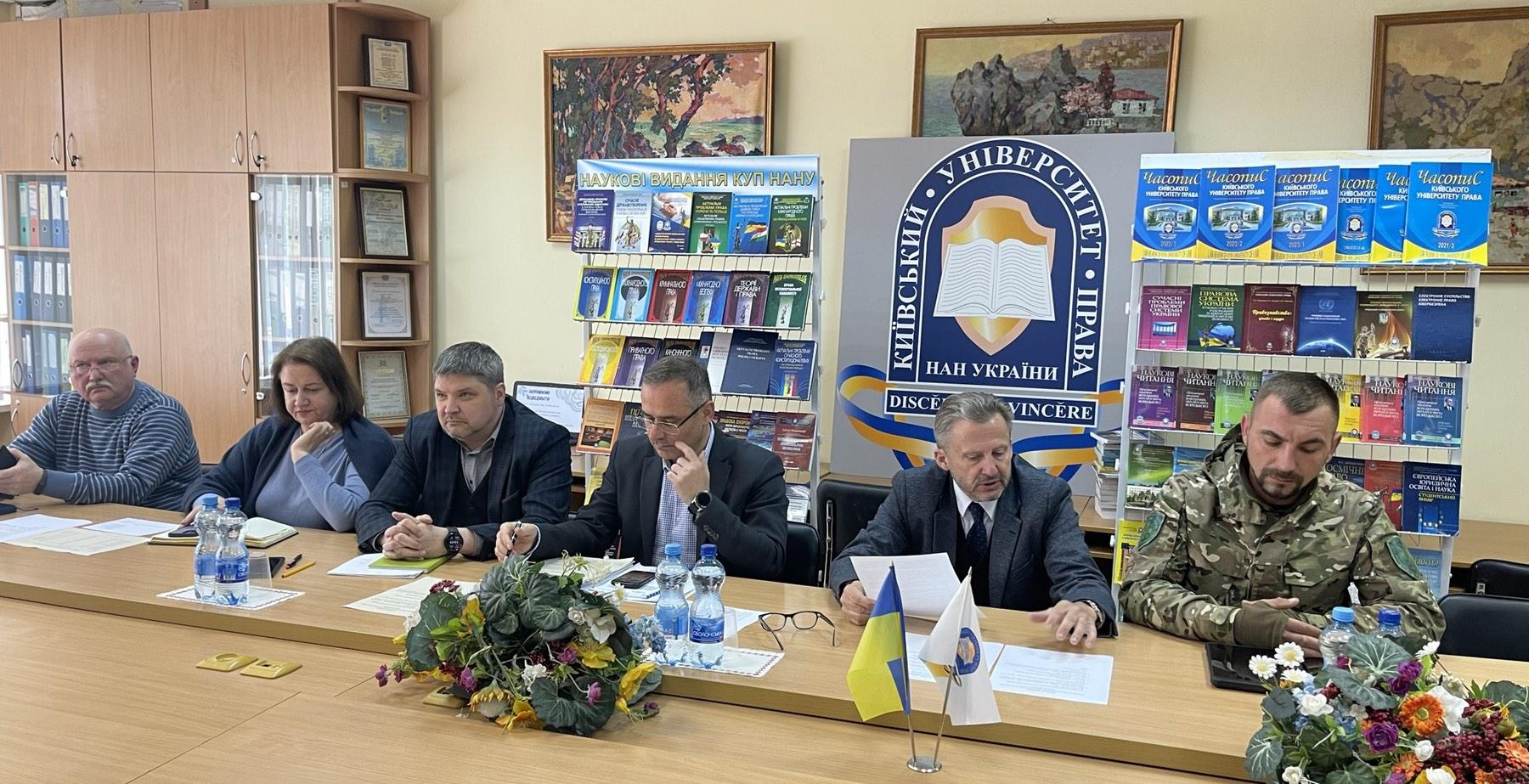 Планове засідання ректорату Київського університету права НАН України, що відбулося в понеділок 22 квітня 2024 року, на запрошення ректора, проф. Юрія Бошицького, відвідав керівник Громадської організації «Міжнародний координаційний центр ветеранів війни» Сергій Іленкуца, активний учасник Революції гідності, волонтер, ветеран російсько-української війни. Гість університету поділився з присутніми інформацією про очолювану ним всеукраїнську ветеранську організацію, що об’єднує ветеранів війни, військових та волонтерів, здійснює комплексну військову підготовку цивільного населення та допомогу Збройним Силам України, захист прав і свобод людини та громадянина; сприяє реабілітації постраждалих учасників бойових дій та осіб з інвалідністю; сприяє духовному відродженню України, відновленню, розвитку та збереженню культурно-історичної спадщини; національно-культурному відродженню й становленню української нації; підтримці національного військово-патріотичного виховання молоді; здійснює співпрацю з територіальними громадами; задоволення суспільних, зокрема, економічних, соціальних, культурних, освітніх та інших інтересів. Також доповідач навів конкретні приклади роботи, яку здійснює ГО для підтримки ветеранів бойових дій та їх сімей, осіб, постраждалих внаслідок війни в Україні, участі організації у відродженні економіки України а також у програмах з реабілітації постраждалих, працевлаштуванні ветеранів, професійної освіти, вирішенні питань житла та інших соціальних питань. У ході зустрічі члени ректорату мали можливість поставити гостю запитання, на які вони отримали розгорнуті та обґрунтовані відповіді. У ході зустрічі були розглянуті можливі напрямки співпраці між Київським університетом права НАН України та ГО «Міжнародний координаційний центр ветеранів війни», основними серед яких, були обрані такі, як співпраця в наданні безоплатної юридичної допомоги ветеранам війни та членам їх сімей, спільна участь у волонтерських благодійних ініціативах.
