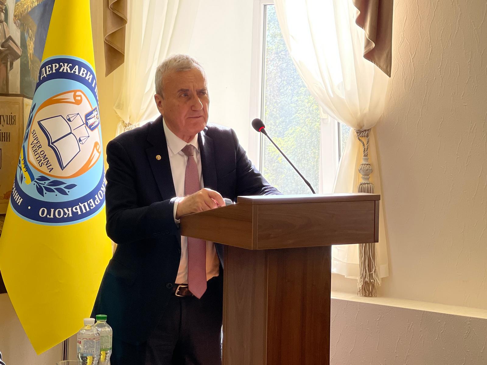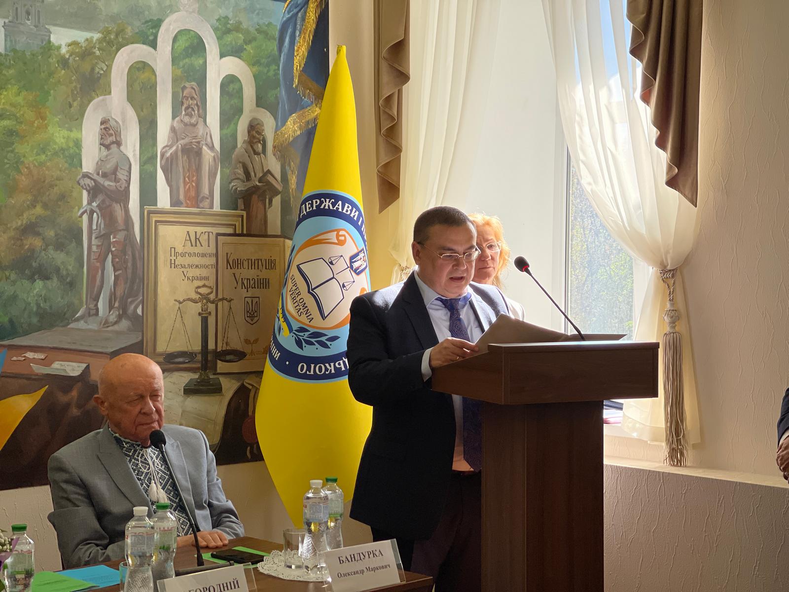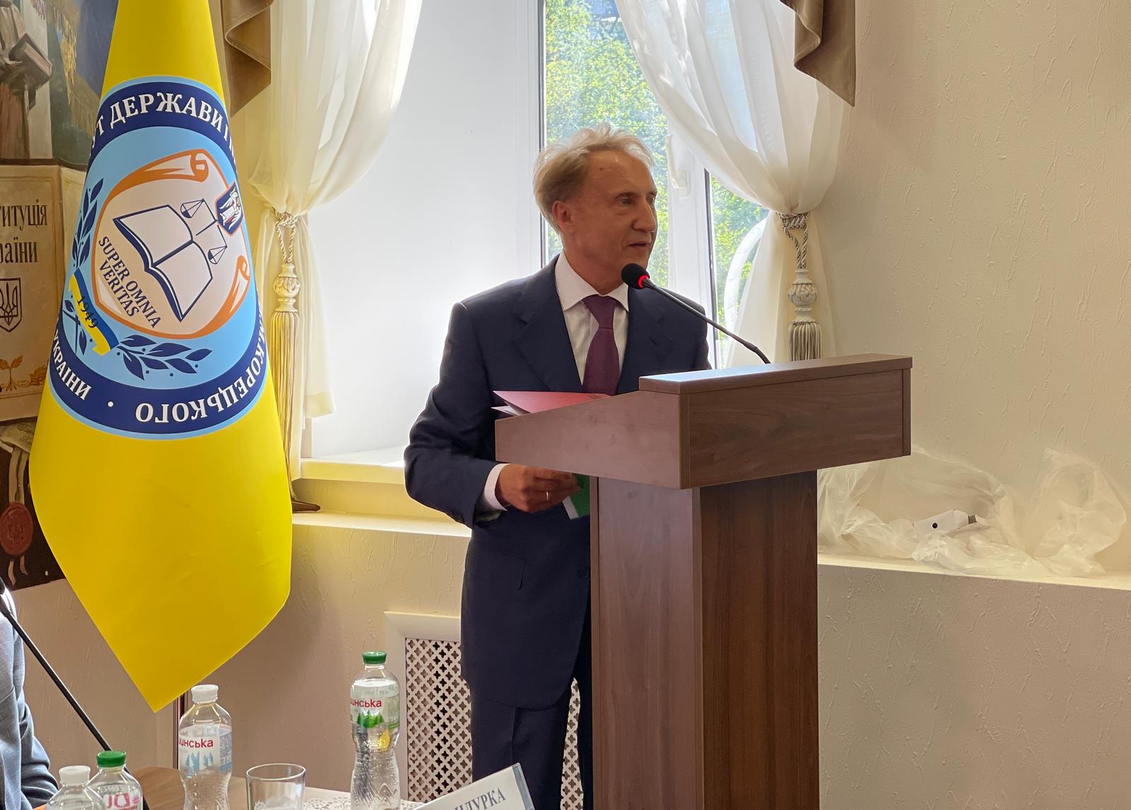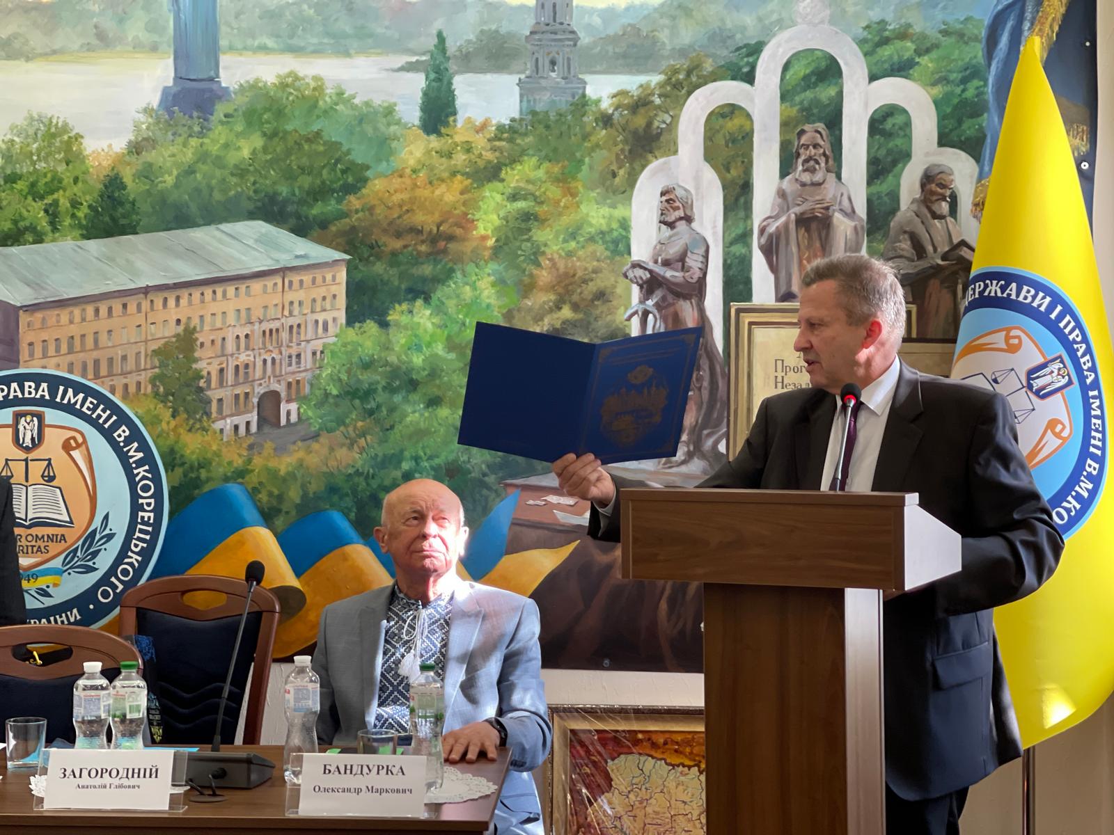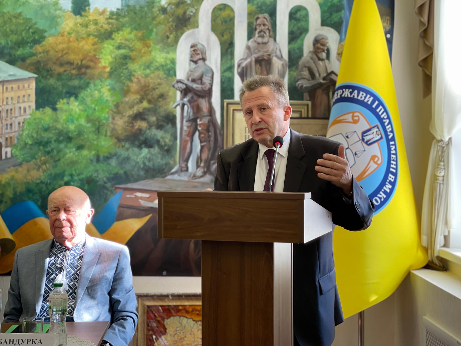 Теплі вітальні слова з нагоди 75-річчя Інституту держави і права імені В.М. Корецького Національної академії наук України пролунали також від професора, Заслуженого юриста України Юрія Ладиславовича Бошицького ‒ ректора Київського університету права НАН України. Юрій Ладиславович у своєму виступі наголосив на органічних партнерських зв’язках, які поєднують обидві установи, що логічно пояснюється тим фактом, що саме Інститут держави і права імені В.М. Корецького НАН України в 1995 році виступив засновником Вищої школи права при Інституті держави і права ім. В.М. Корецького НАН України, правонаступником якої є Київський університет права НАН України.
