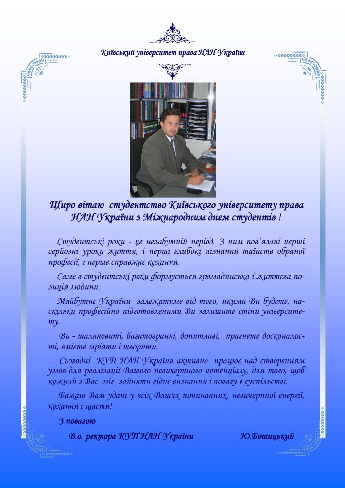 Привітання з Міжнародним днем студента в.о. ректора КУП Ю.Л. Бошицького