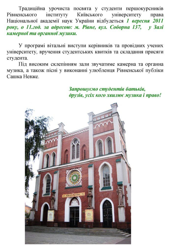 Увага! 1.09.2011 р. о 11.00 год, у Залі камерної та органної музики відбудеться урочиста посвята в студенти першокурсників Рівненського інституту КУП НАН України