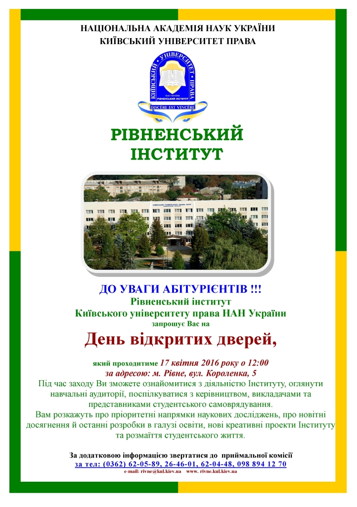 Увага! 17 квітня 2016 р. о 12.00 год. у Рівненському інституті КУП НАН України відбудеться День відкритих дверей!