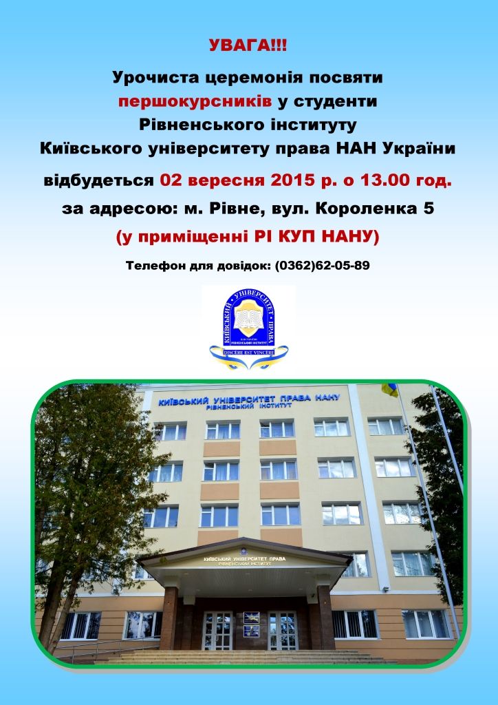УВАГА!!! Урочиста церемонія посвяти першокурсників у студенти Рівненського інституту Київського університету права НАН України відбудеться 02 вересня 2015 р.