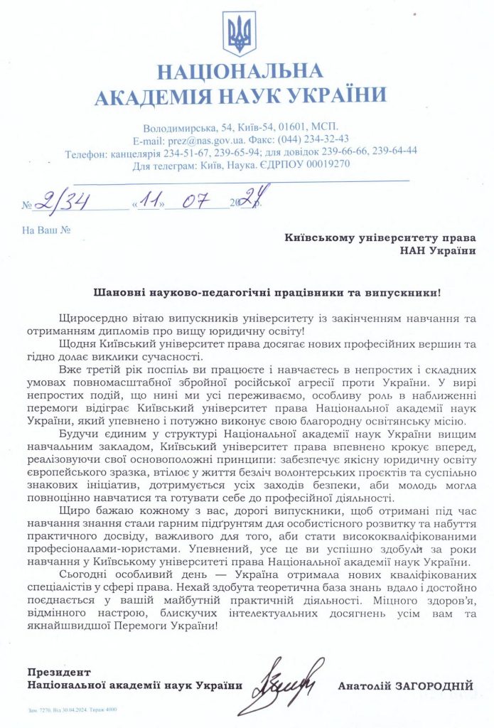На адресу університету надійшов лист-привітання для випускників від Президента Національної академії наук України, академіка НАН України Анатолія Загороднього.