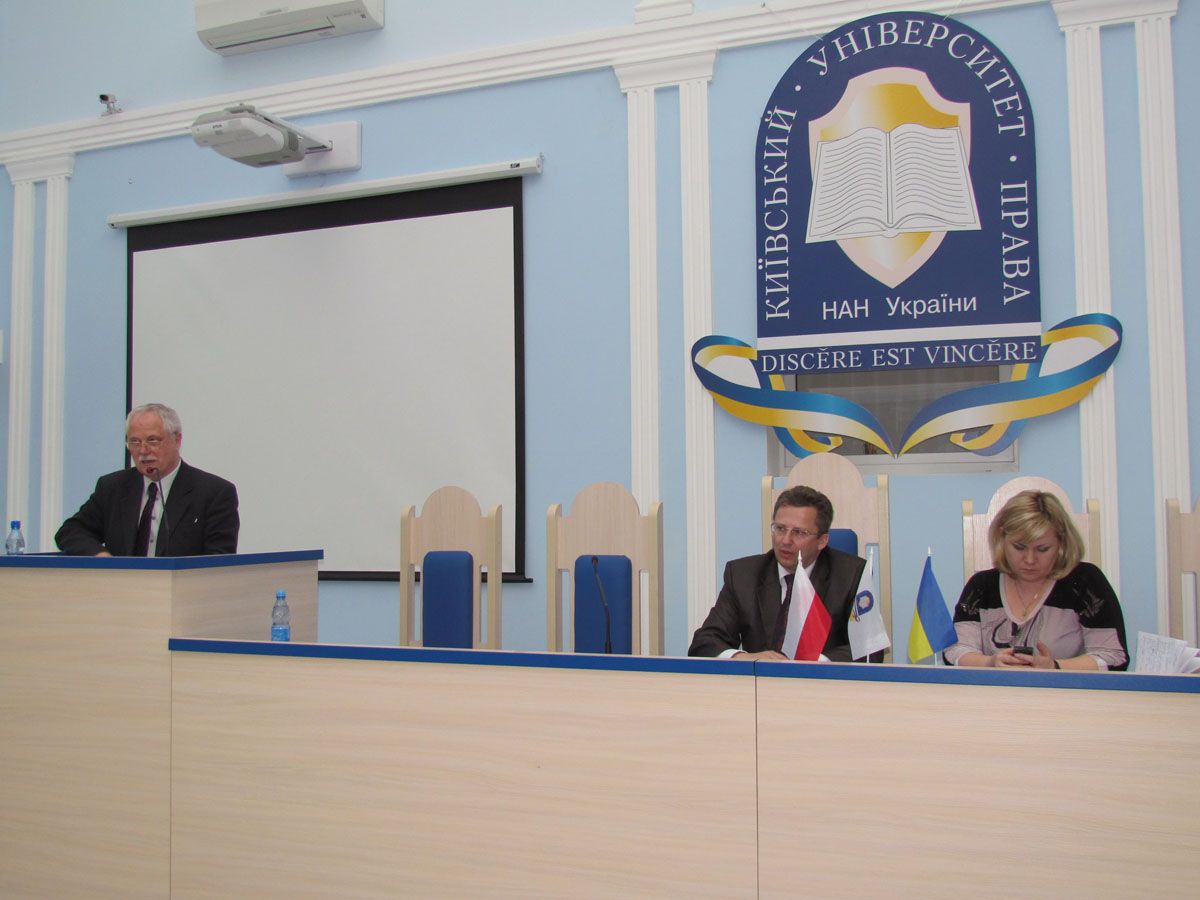 Перед студентами та співробітниками університету Анджей Шміт виступив з доповіддю на тему «Пропозиції щодо зміни правового становища Президента Польщі на підставі законопроекту внесеного депутатами до зміни в Конституції». На майстер-клас зібралися студенти та науково-педагогічні працівники Київського університету права НАН України. Пан Шміт наголосив на тому, що президент Польщі Броніслав Коморовський запропонував внести низку змін та доповнень до польської конституції, що закріпило б вищість євросоюзного права над національним. Крім того, польський президент вважає, що в Конституції потрібні зміни, котрі підготують країну до впровадження спільної європейської валюти – євро. Професор Шміт зауважив, що рішення про входження в зону євро – це системне рішення такого ж значення, як вступ Польщі в Європейський Союз. Більше того, наслідки впровадження у Польщі євро для країни можуть бути набагато відчутнішими, ніж вступ в ЄС.