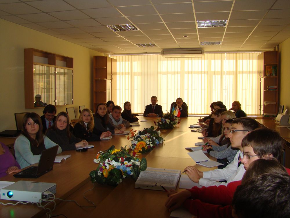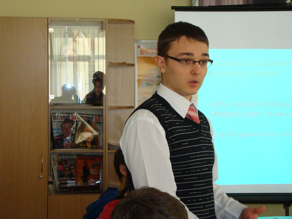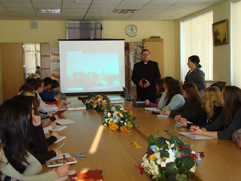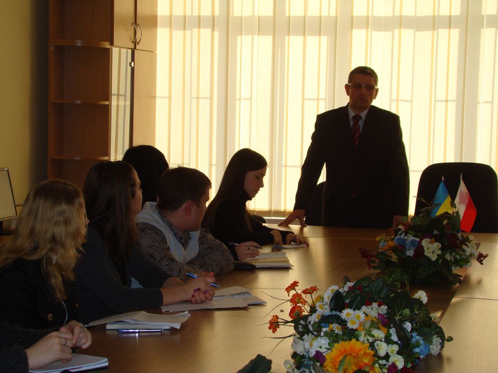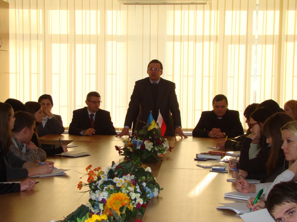 Професор Дебінський розпочав свою промову з комп’ютерної презентації Католицького університету, після чого розповів студентам про юридичний факультет а також про місце Католицького університету в системі вищої освіти Польщі. Професор Дебінський поділився своїми враженнями щодо новітніх методик навчання, які використовує університет, про перспективи, які відкриває Болонська система освіти для студентів, також про можливості та перспективи працевлаштування майбутніх юристів в Польщі.
