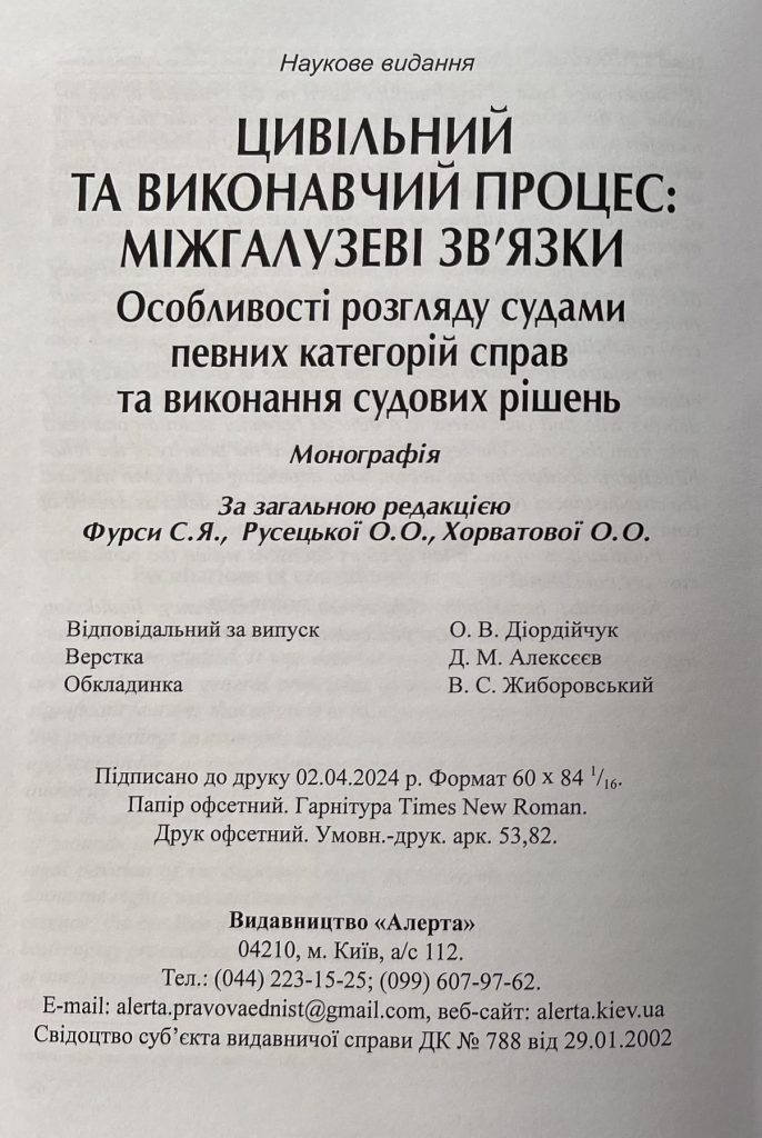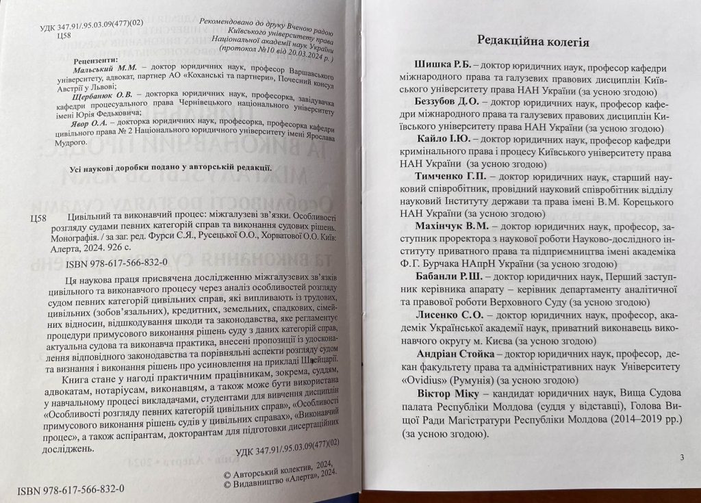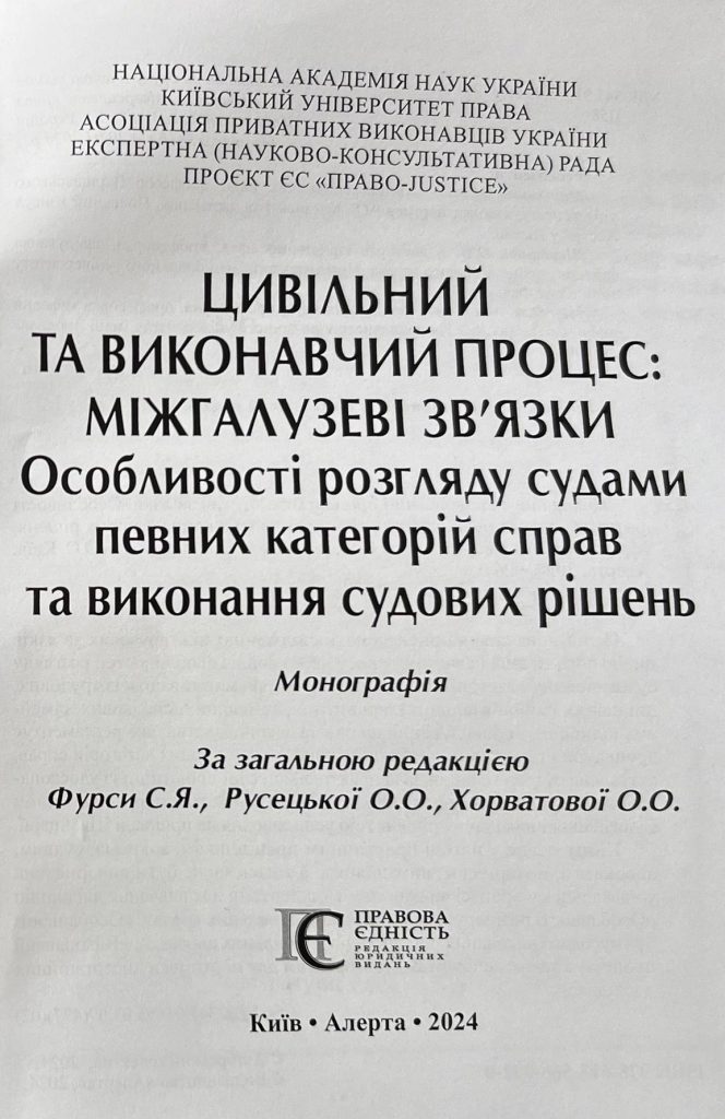 Щойно побачила світ колективна монографія «Цивільний та виконавчий процес: міжгалузеві зв’язки. Особливості розгляду судами певних категорій справ та виконання судових рішень» за загальною редакцією доктора юридичних наук, професора, в.о. завідувача кафедри міжнародного права та галузевих правових дисциплін Київського університету права НАН України Світлани Фурси, кандидата юридичних наук, доцента, доцента кафедри міжнародного права та галузевих правових дисциплін Київського університету права НАН Оксани Хорватової та Голови Ради Асоціації приватних виконавців України Оксани Русецької. Наукову працю видано за сприянням Національної академії наук України, Київського університету права НАН України, Асоціації приватних виконавців України, Експертної (науково-консультативної) ради та Проєкту ЄС «Право-JUSTICE».